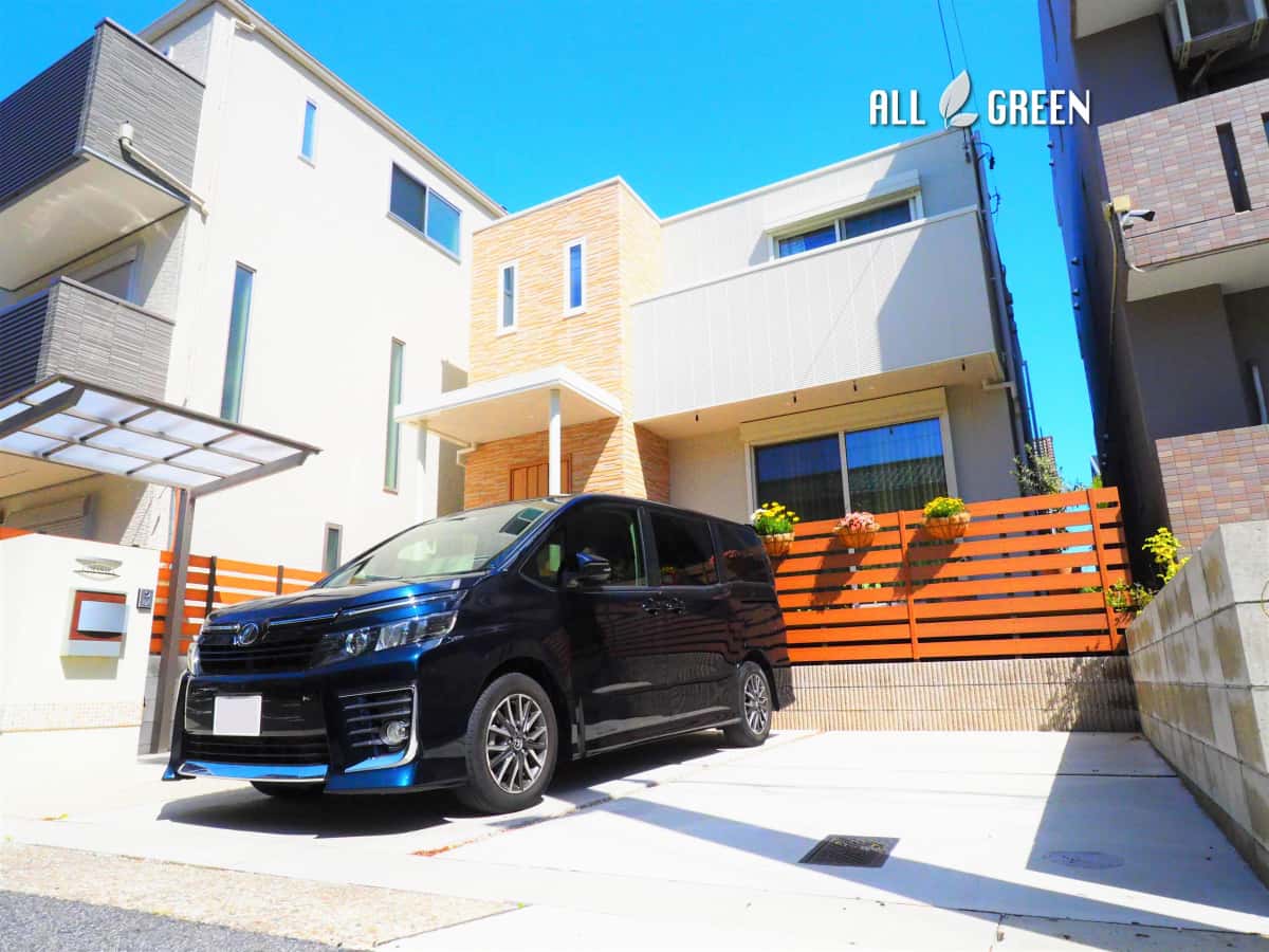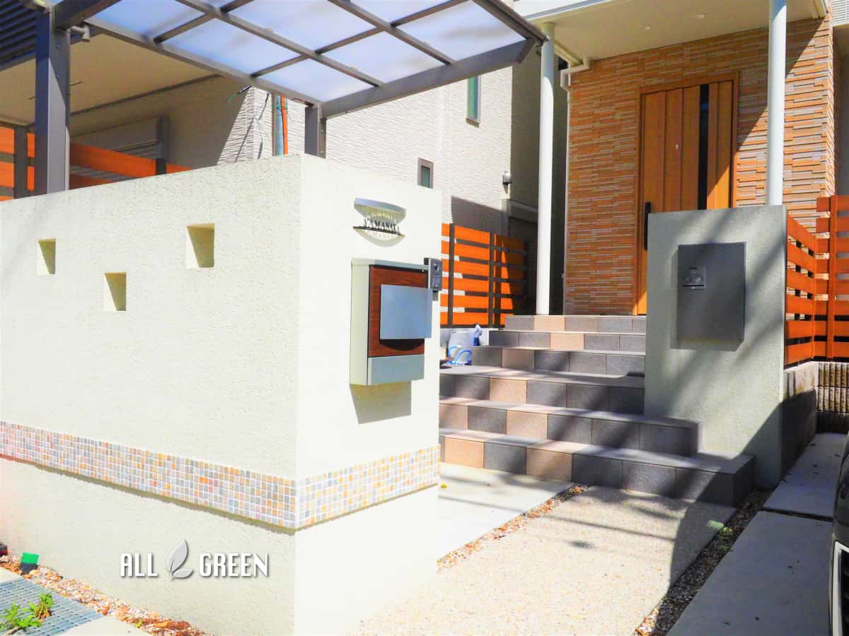 | 工事内容 | 千種区 Y様邸 新築外構工事 階段工事・門塀工事・アプローチ工事・土間コンクリート工事・目隠しフェンス工事・ウッドデッキ工事・サイクルポート工事・立水栓工事 |