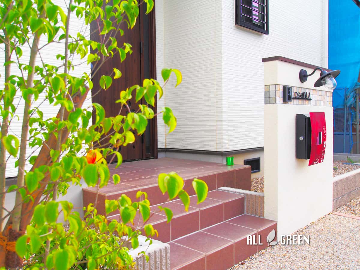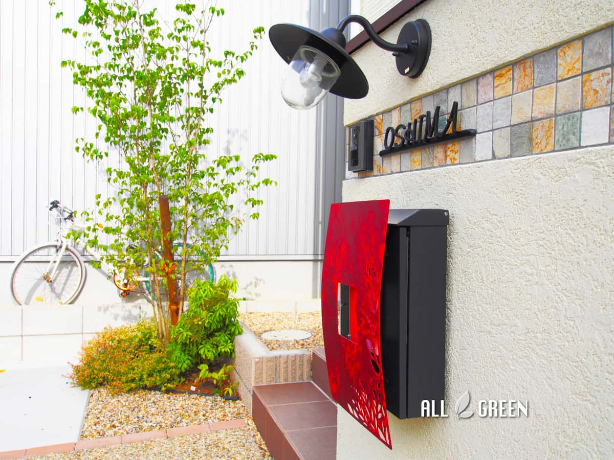 色味でいうとポストには暖色の代表ともいえる赤色を、門塀のアクセントにはオレンジやピンクなどたくさんの暖色がつかわれているタイルを使用しています。