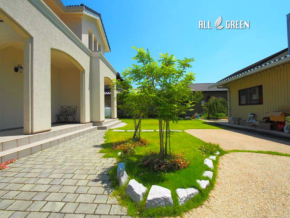 青々と茂る芝は高麗芝。高麗芝は成長が緩慢で病害虫にも強いので管理が比較的簡単な芝です。