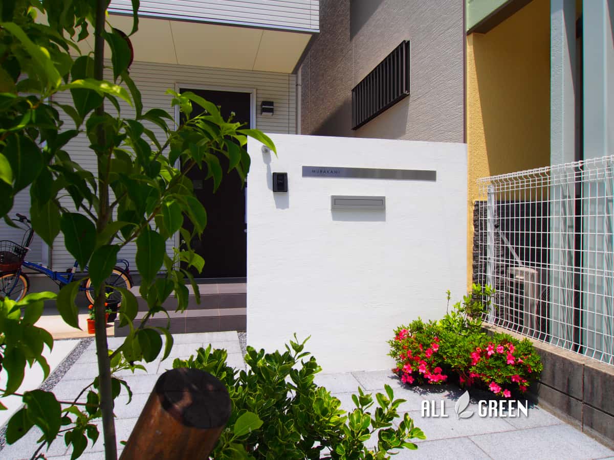 門塀の手前にも小さめの植栽スペースを作り、鮮やかな花の咲く低木を入れ色を加えました。