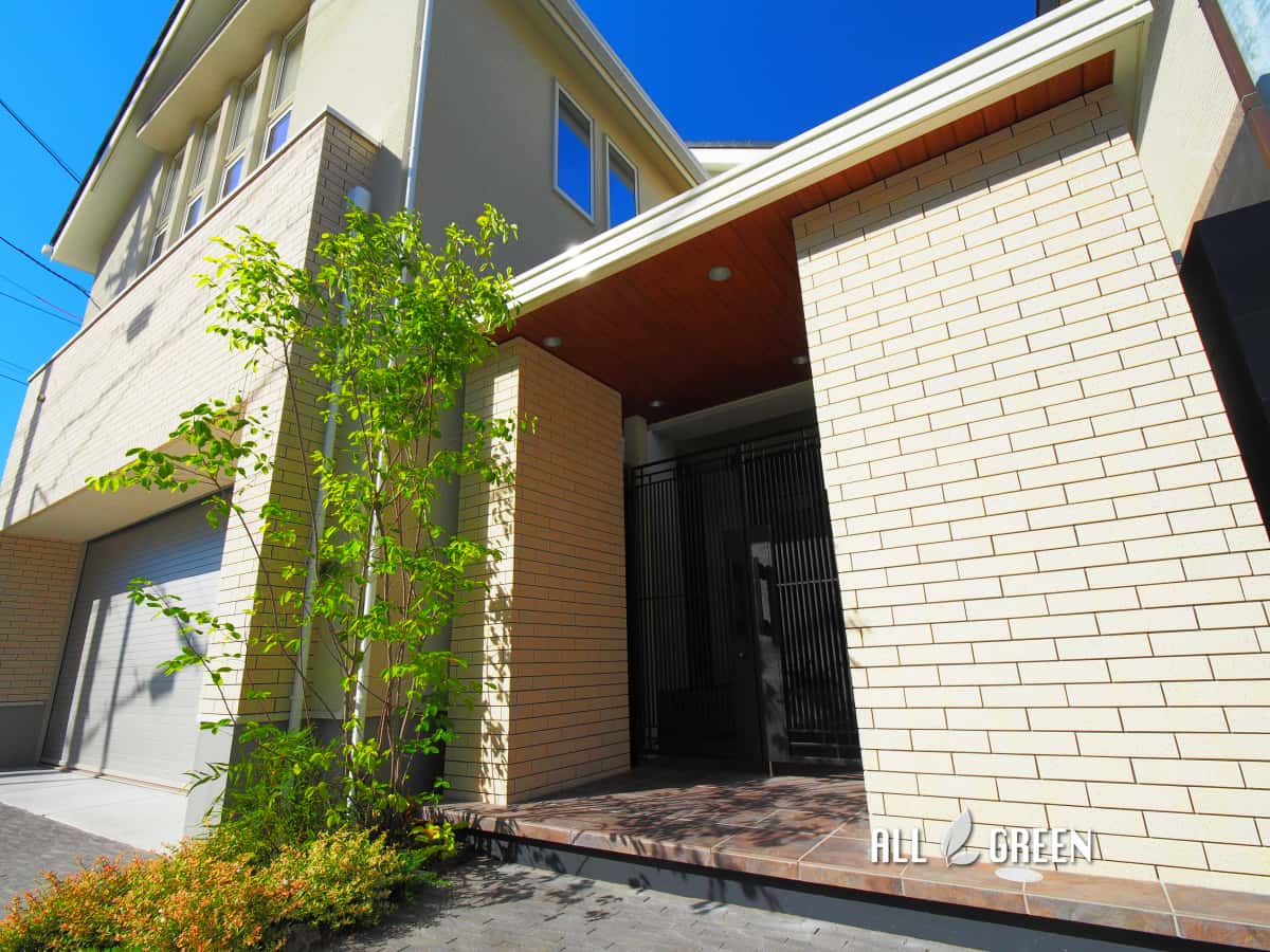 明るい色のレンガから覗くシックな色合いのシャローネ門扉は全体をパキッと締めてくれる役割も果たしていますね。