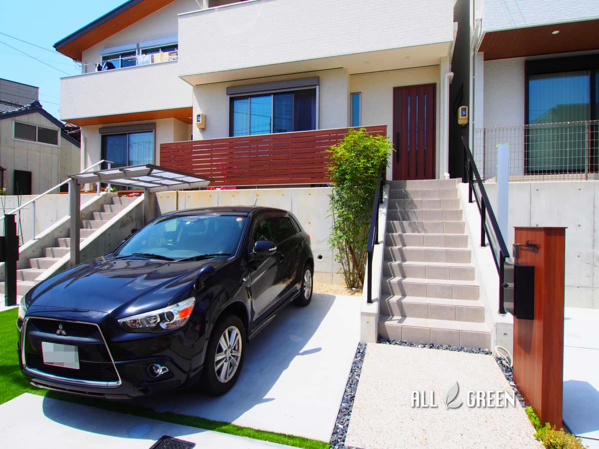 木調の門塀と人工芝の緑が目を引く名古屋市瑞穂区の新築外構工事