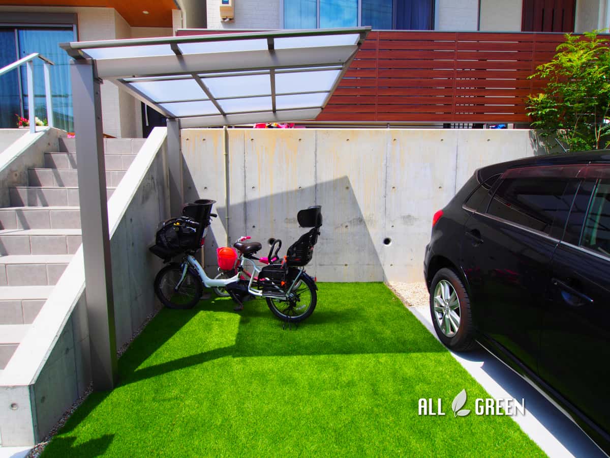 はっきりとした色の人工芝に負けないよう、はっきりとした木調色のフェンスや門柱を使いバランスを整えました。