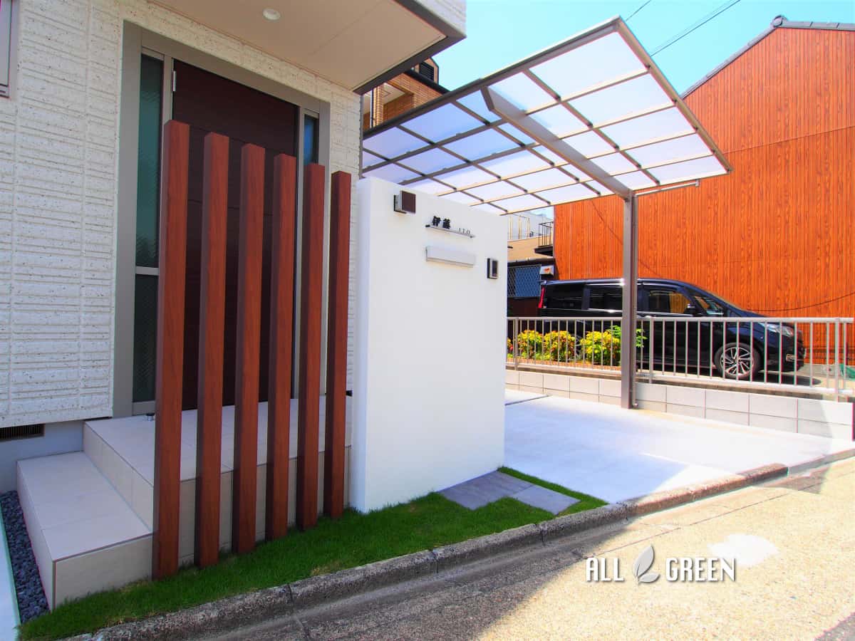白を基調とした門塀の周りには天然芝を敷き、門塀横には木調の角柱を設置。
