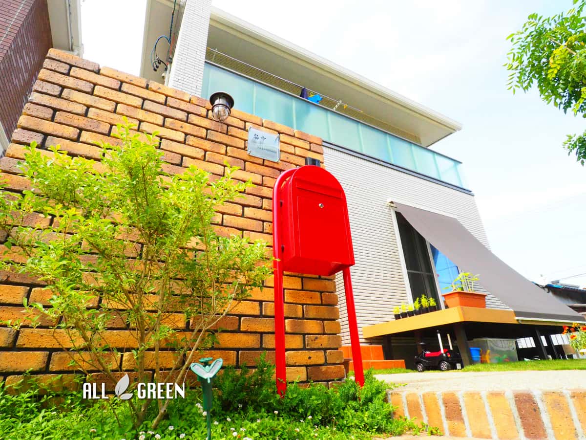 レンガの門塀に赤いポストを設置し可愛らしい印象の門まわりをデザインさせていただきました。