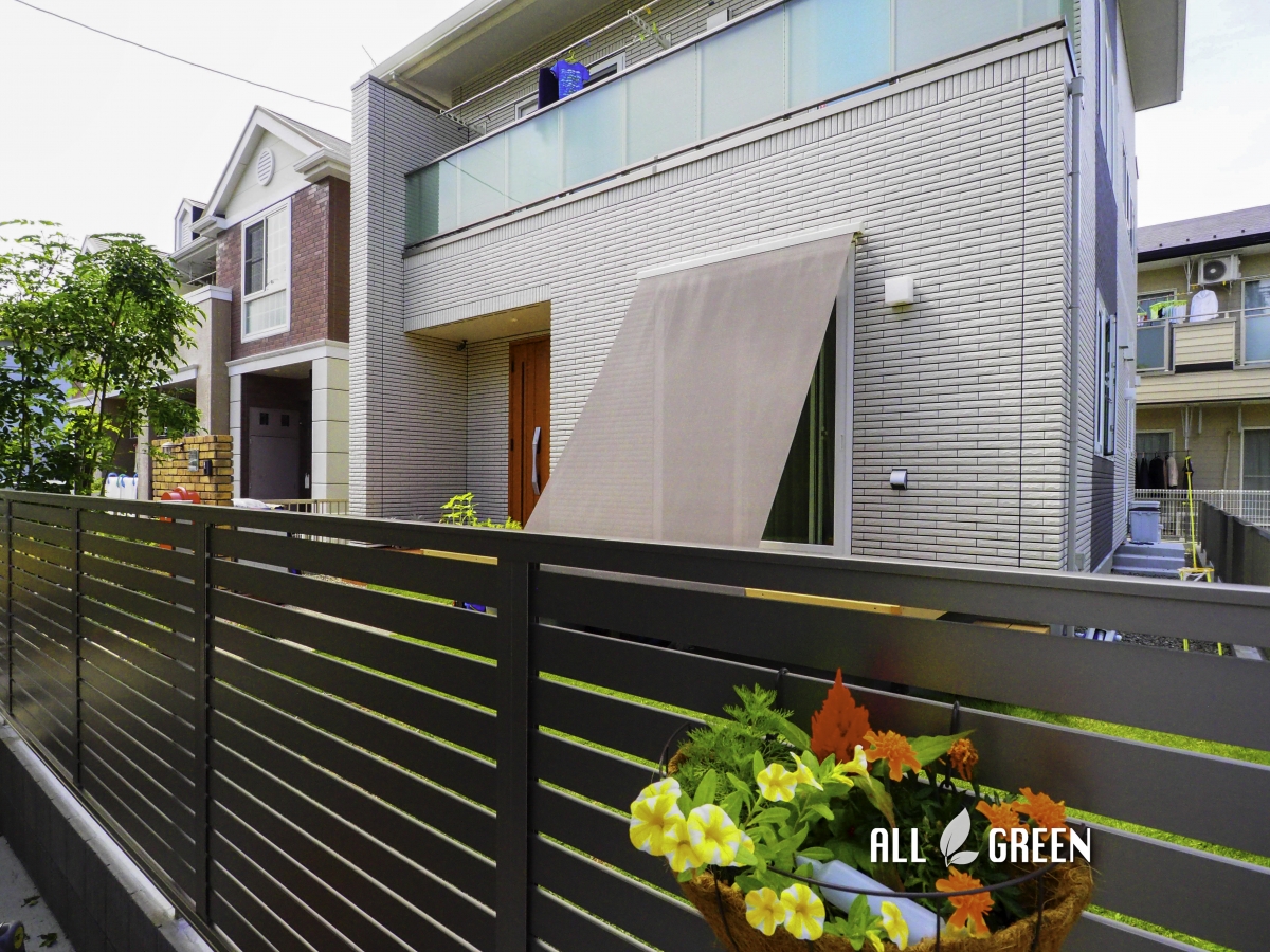 芝生の緑に映える赤色の立水栓は、パンと周囲のフェンスがアルミ色なのでとてもいいアクセントとなっています。