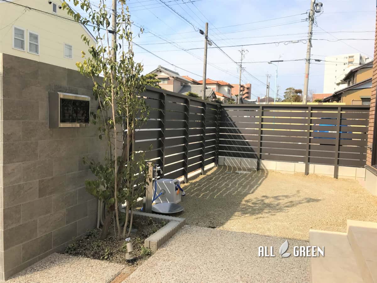 ファサードの右側、タイルテラス前はブロックを積み、フェンスで目隠しをしました。
