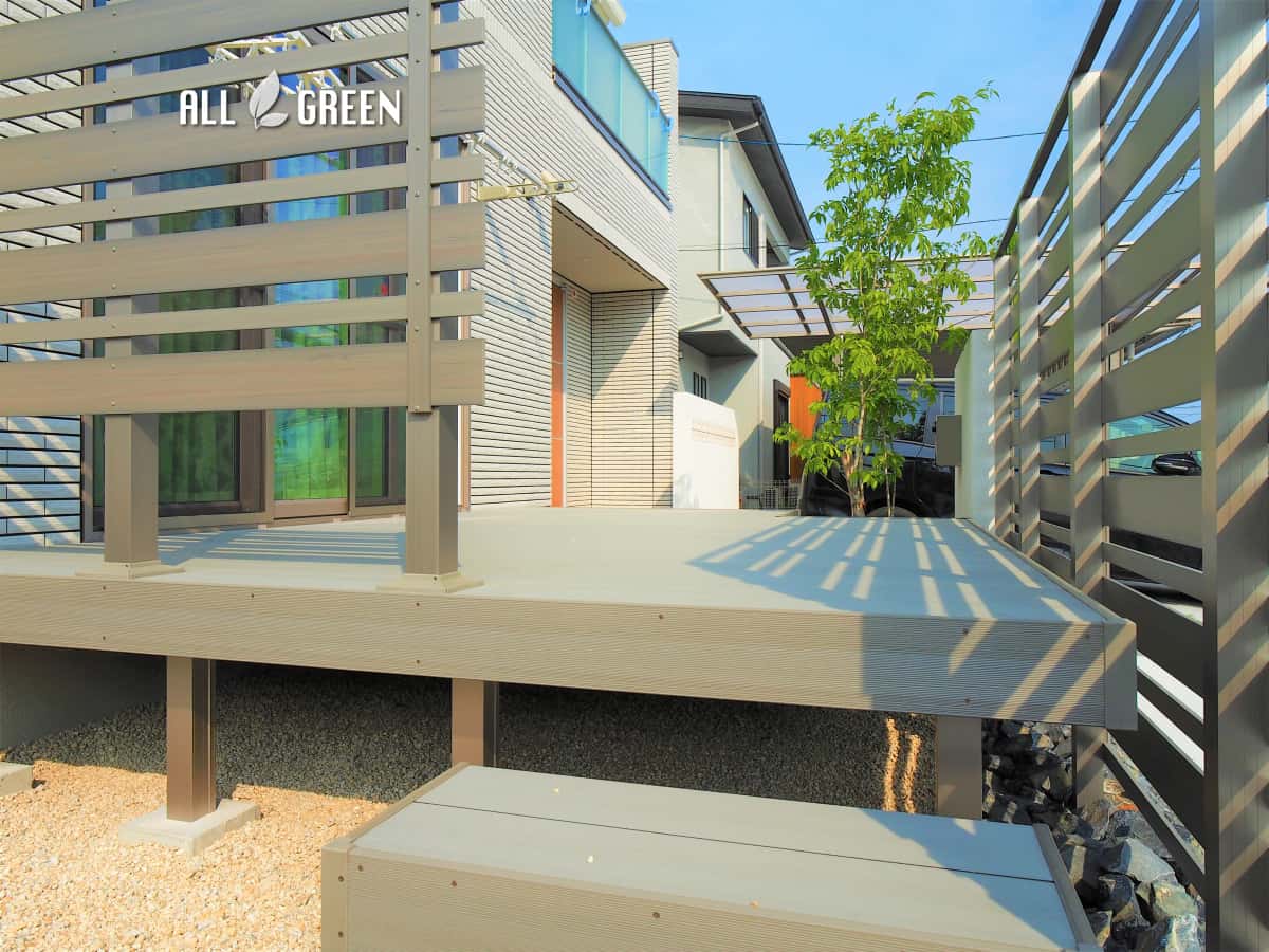 ウッドデッキはLIXILの人工木デッキ、樹ら楽ステージを設置。