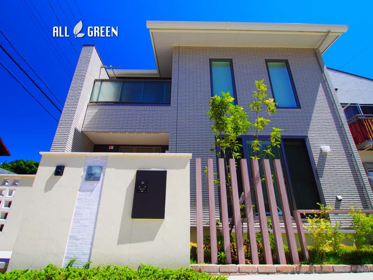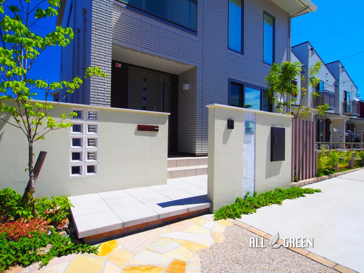 | 工事内容 | 北区 O様邸 新築外構工事 門塀工事・階段工事・アルミ枕木材工事・土間コンクリート工事・アプローチ工事・宅配BOX・照明工事・植栽工事 |