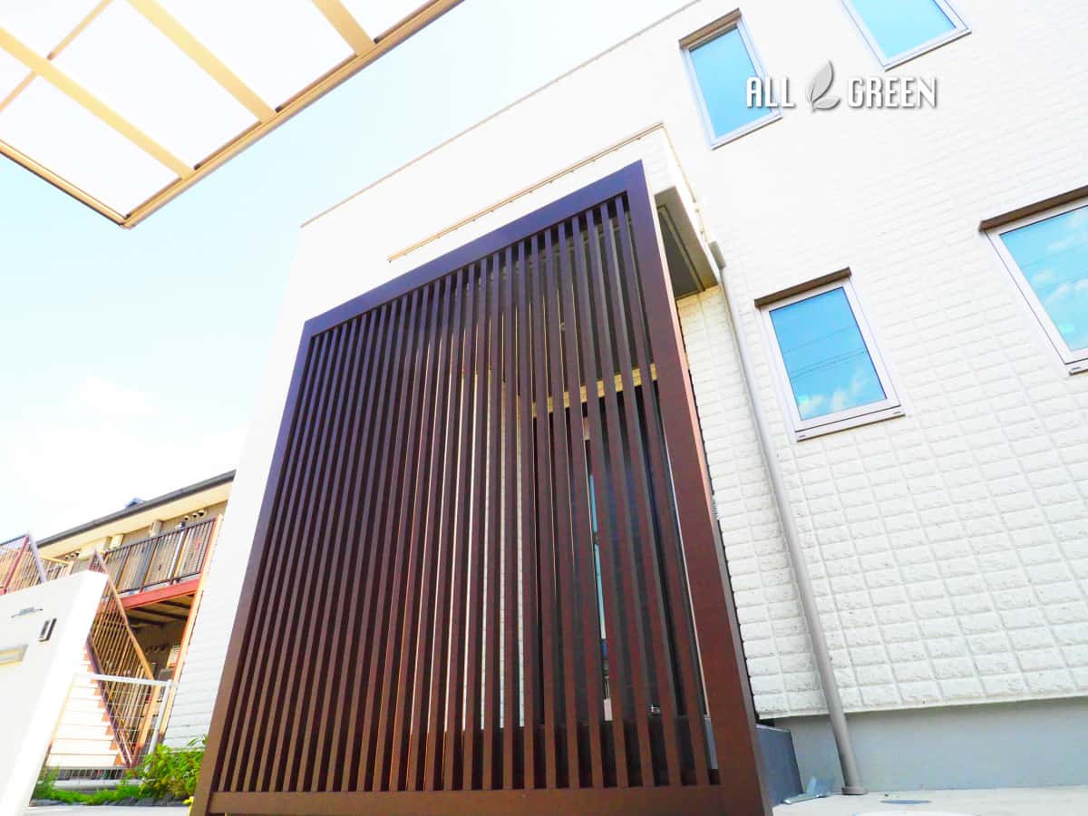 また、前面道路の交通量が多く玄関が丸見えなので目隠しをしたいというお施主様のお悩みには、LIXILのプラスG木調縦格子スクリーンでお洒落に解決致しました。