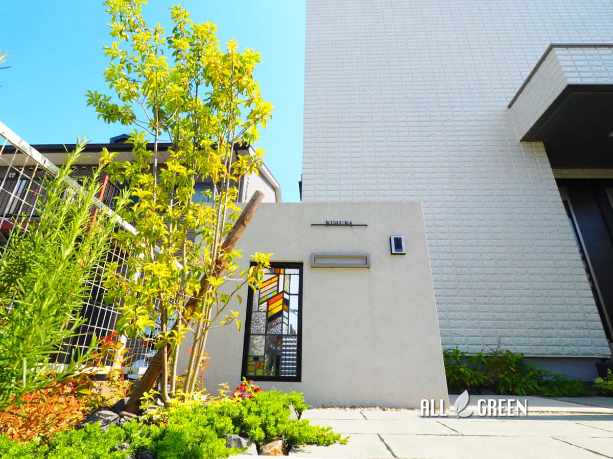 友人が作ってくれたステンドグラスを門塀にはめ込みたいというご希望のもと、門塀は白の塗壁のみのシンプルなものにし、ステンドグラスが目立つようにしました。