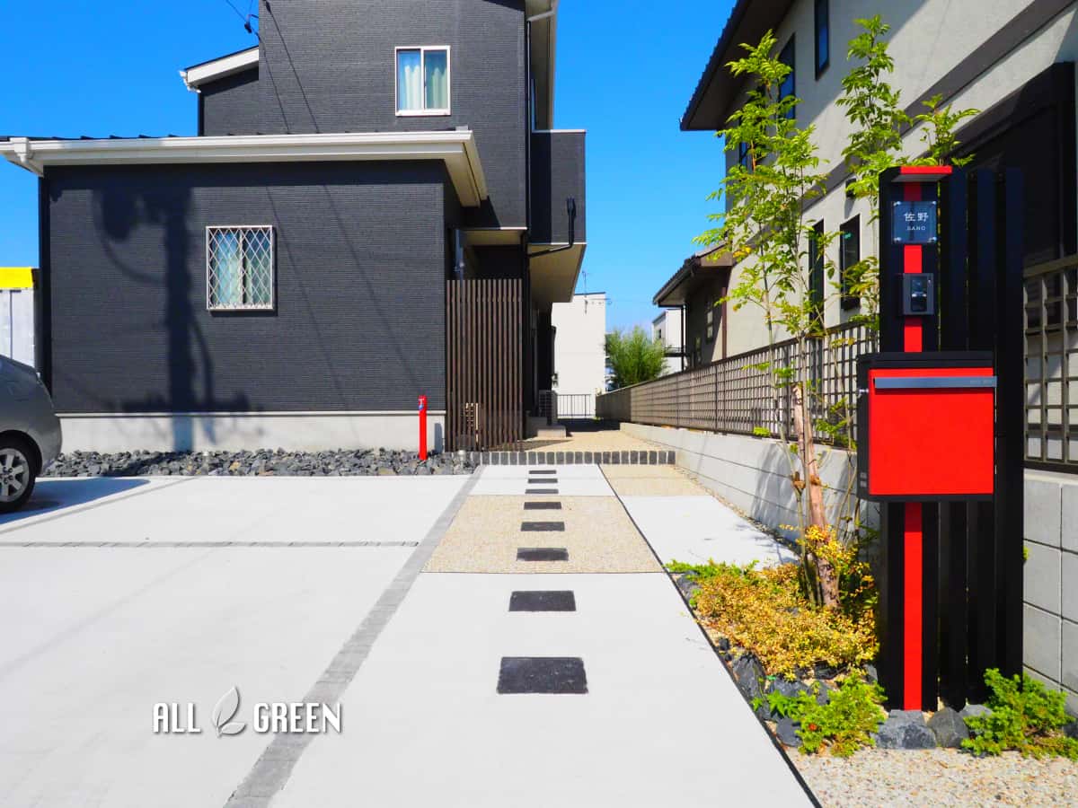 特にポストと立水栓は外壁や機能門柱の柱部分の暗色とも合う赤のアクセントカラー入れることによってシンプルだけどインパクトのあるものを演出できたかと思います。