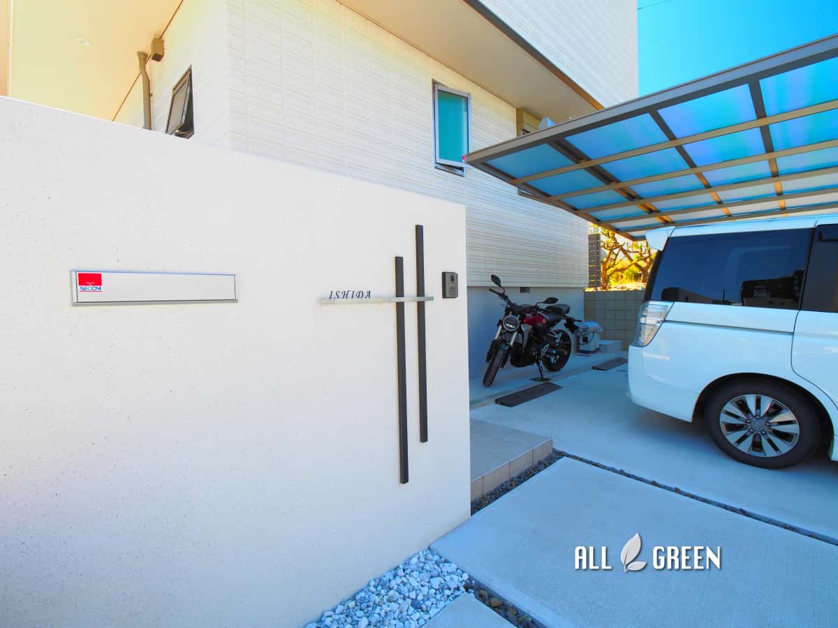 門塀は外壁と同系色の白系の色で塗装し、モダンな表札を取り付けました。