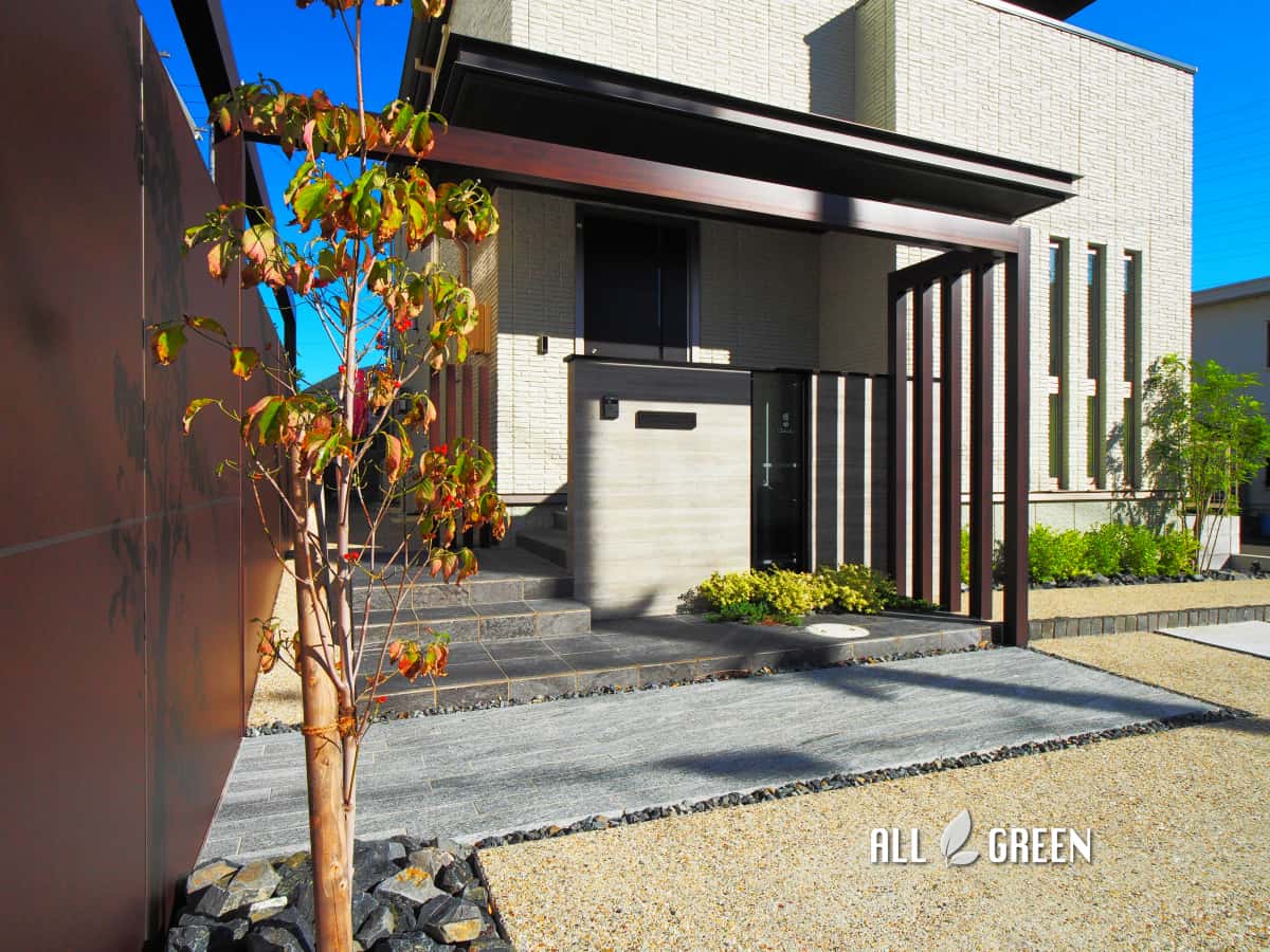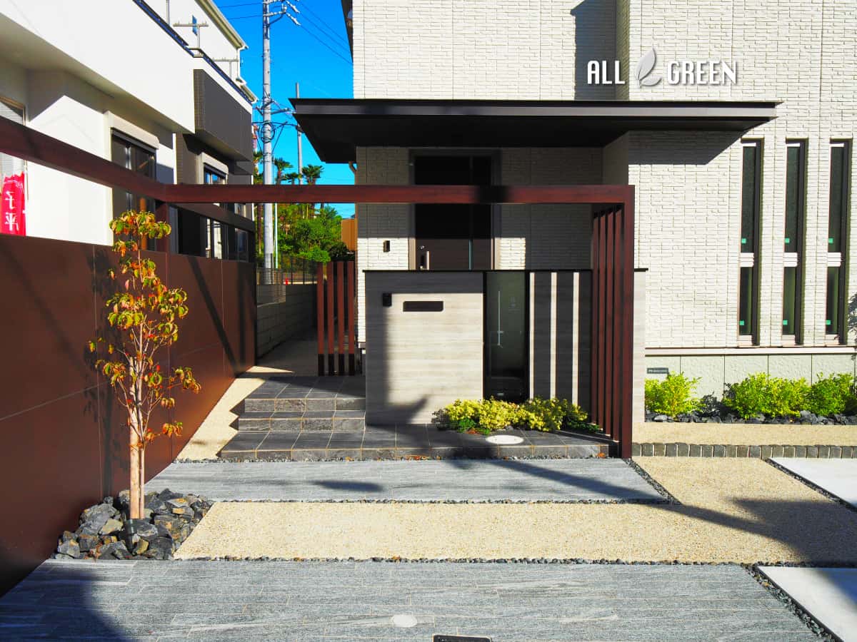 | 工事内容 | 名古屋市天白区 T様邸 新築外構工事 階段工事・門扉工事・土間コンクリート工事・アプローチ工事・スロープ工事・目隠しフェンス工事・植栽工事・照明工事 |