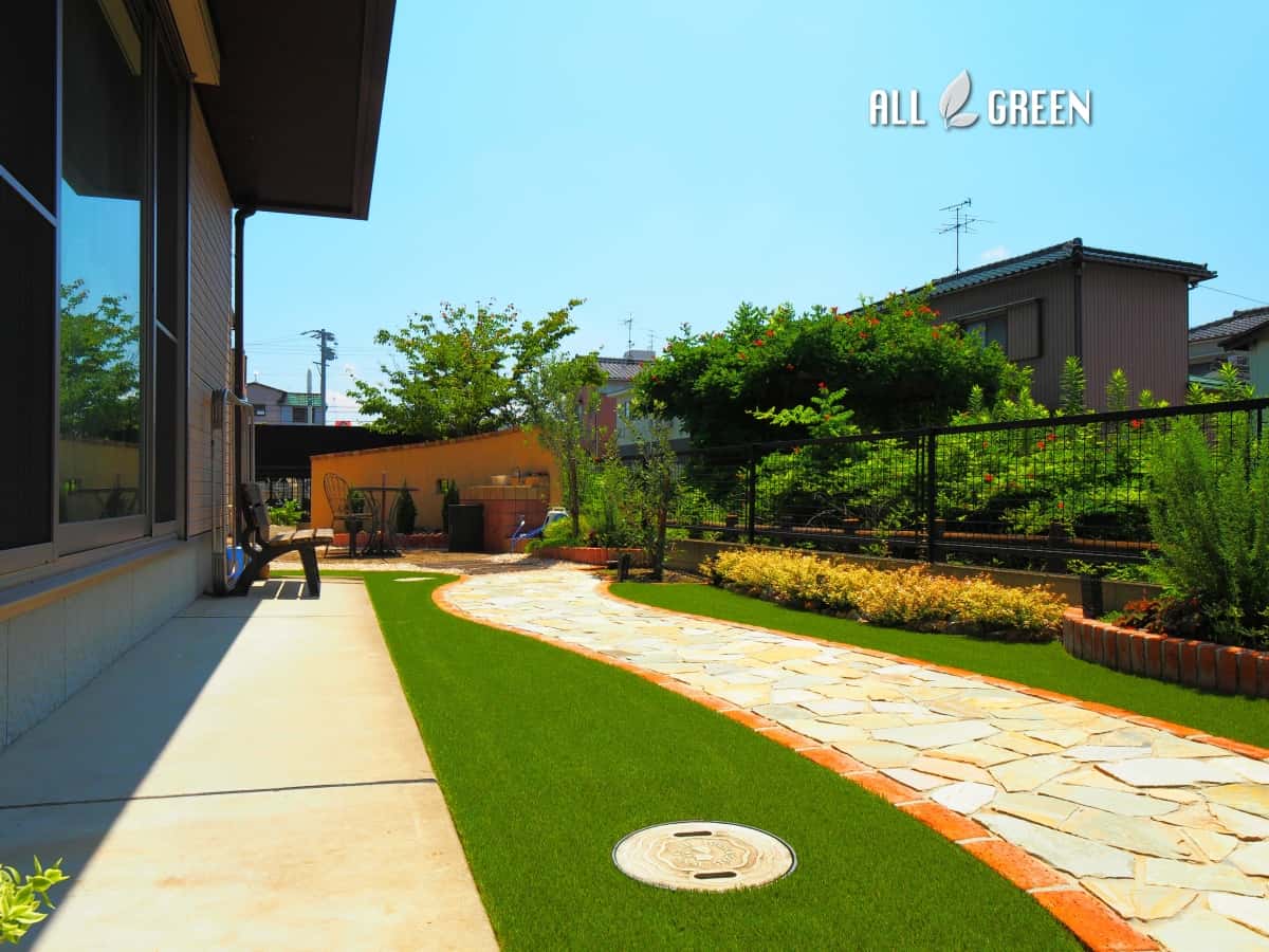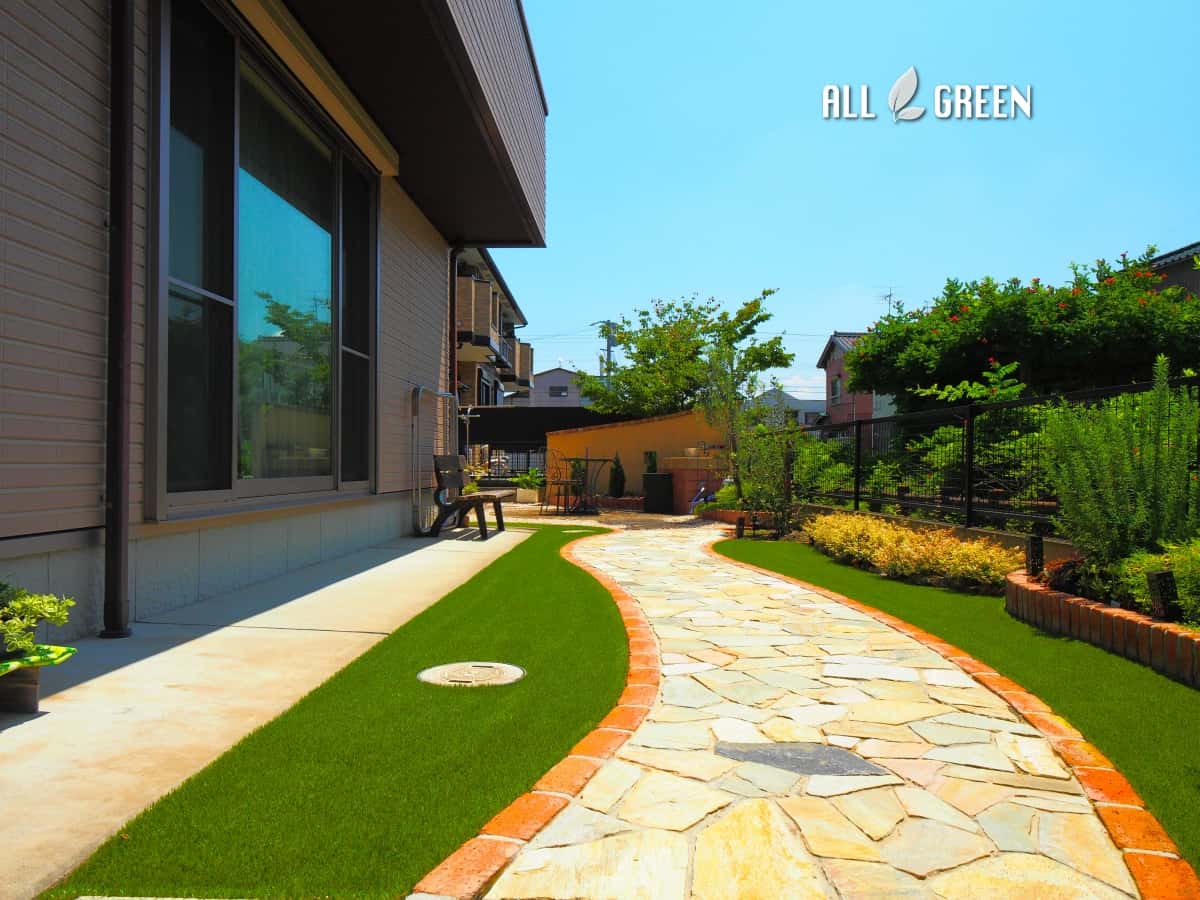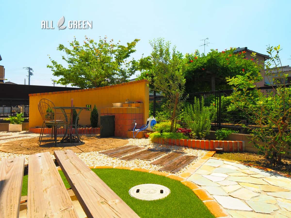 | 商品 | 人工芝:エクアライブ ZEROターフ+防草シート 乱形石貼り舗装:UNISON クレモナストーン(ゴールデンイエロー) 見切り:UNISON ソイルレンガ210(アンチックオレンジ) 花壇(小端立て):UNISON ソイルレンガ210(アンチックオレンジ) |