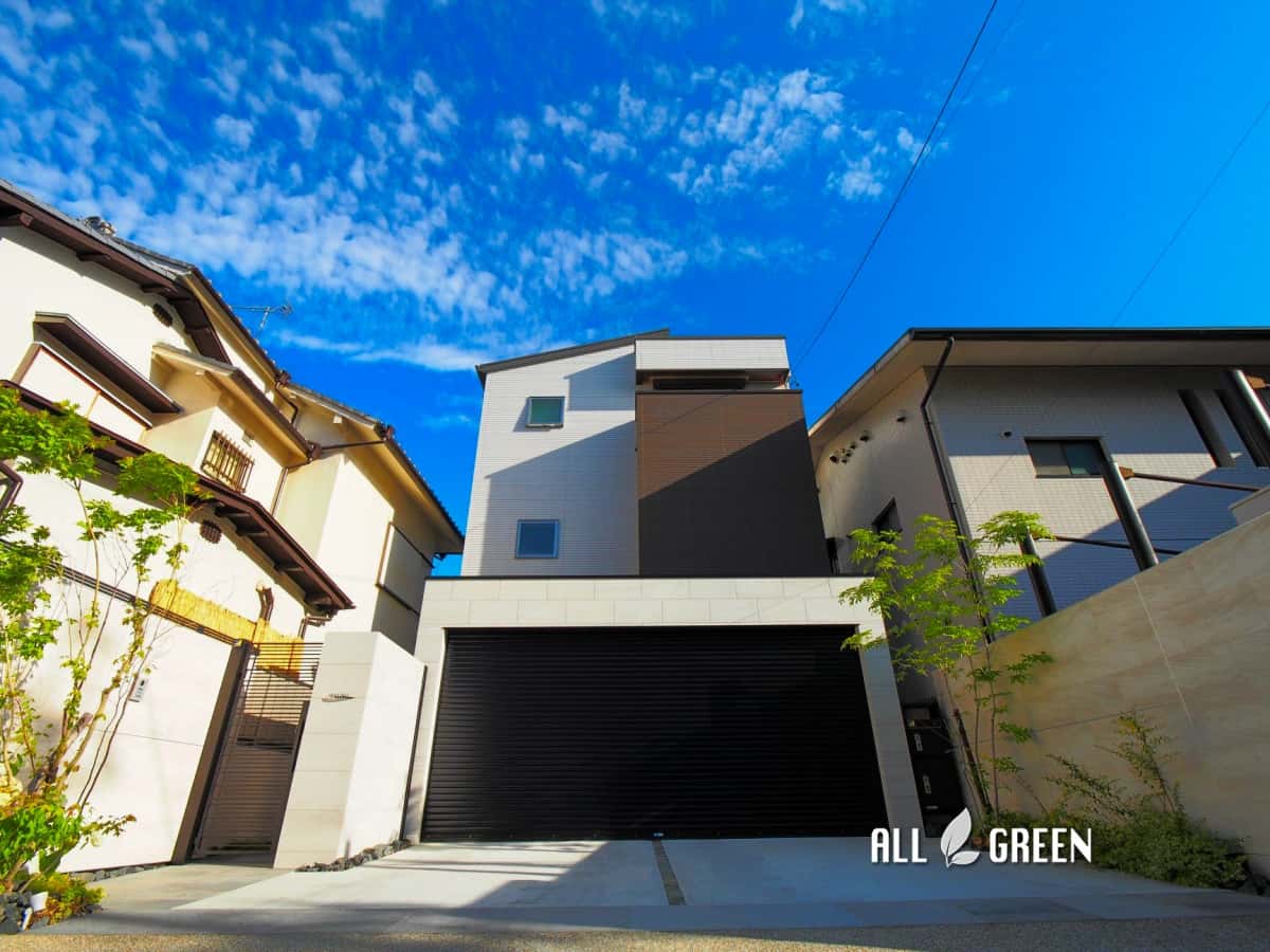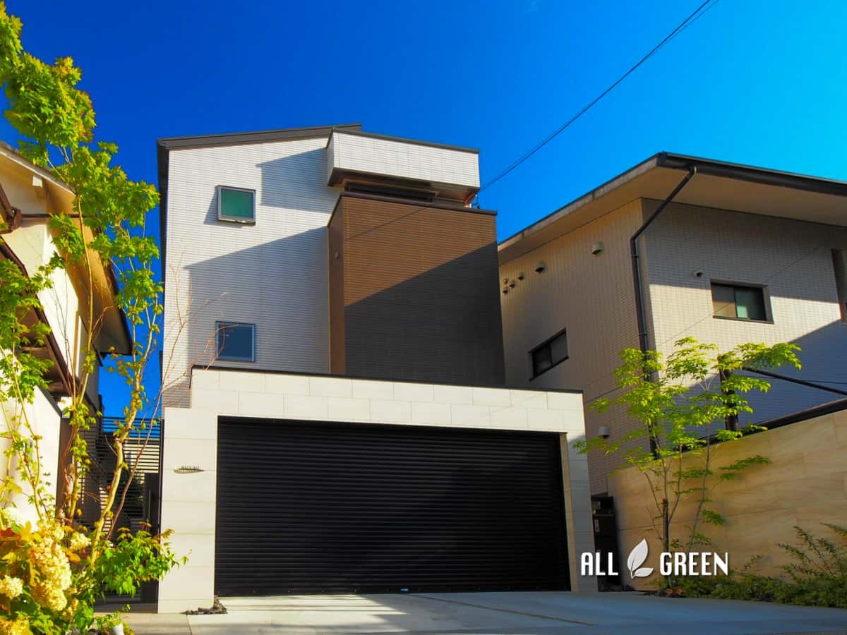 全体的なバランスとして水平ラインを大事にしているこちらの邸宅は、なんといってもドンっと出迎えてくれるシャッターゲートが印象的。