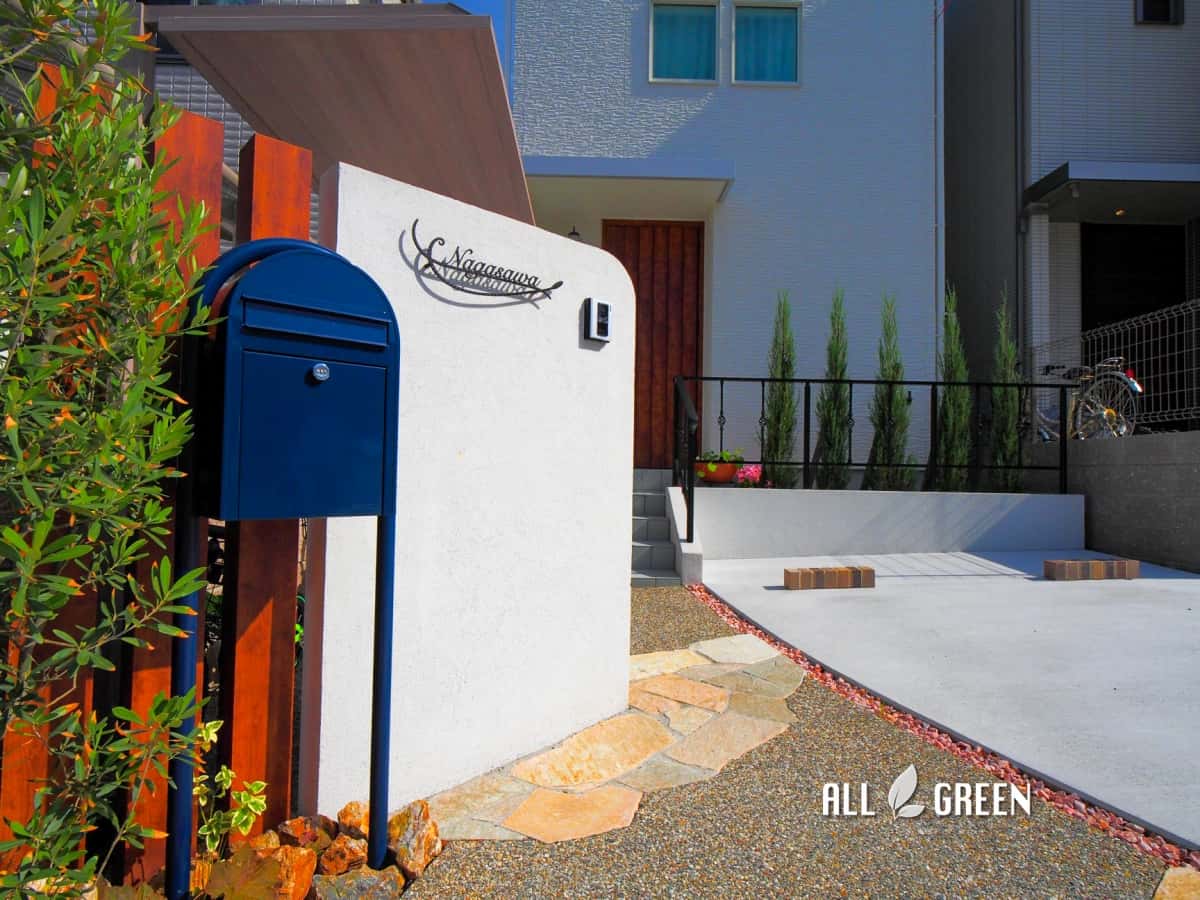 白色の壁、木調の角柱、ネイビーのポスト。この3つのコントラストが邸宅の良さをさらに引き立ててくれています。
