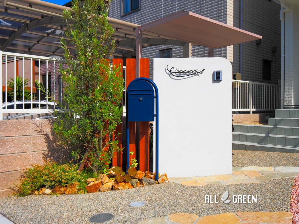 門塀前のオリーブの木と建物前のスカイロケットがさらに自然の温もりを際立たせてくれていますね。