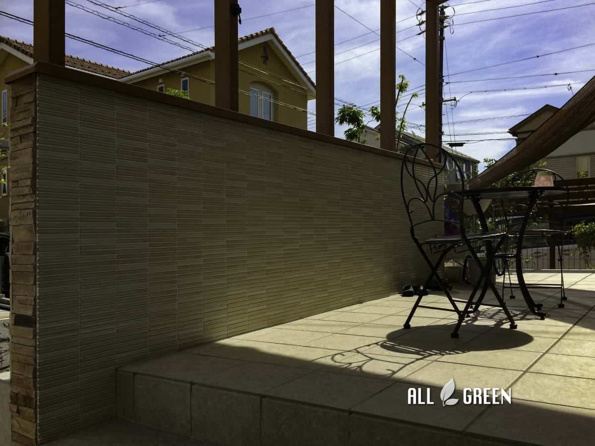 ココマサイドスルーを採用したセミオープンなタイルテラス空間が完成。