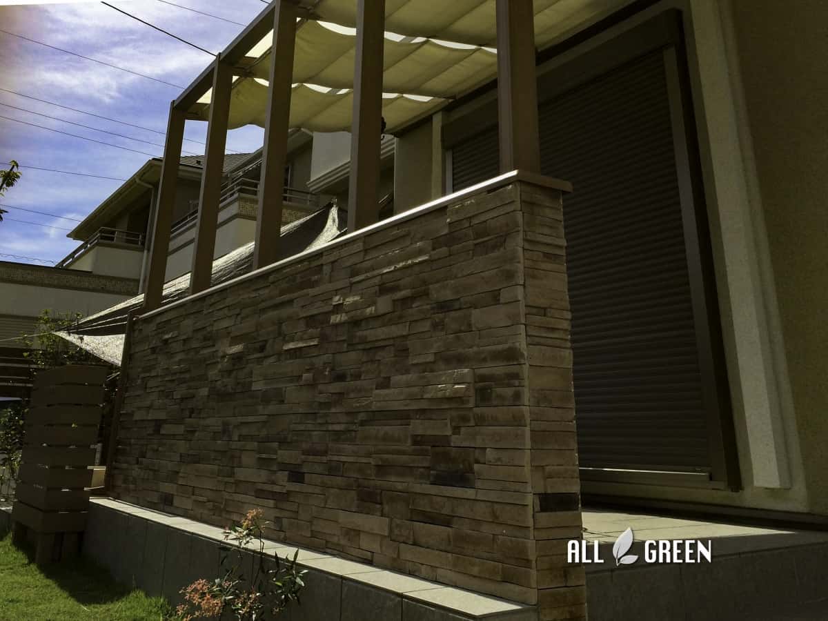 | エクステリア商品 | タイルテラス:INAX マルモアート(IPF−300/MA−14) LIXIL cocomaII オープンテラス腰壁タイプ (クリエラスク+シャイングレー) 外・側面:Onlyone プロフィットレッジストーン(サウスウエストブレンド) 内面:Onlyone エリアボーダー彩(LB−802:LB−9742=8:2) 内部日除け(グレー) 屋根材(クリアマット) 立水栓:UNISON ウンディーヌ フェンス:タカショー エバーウッド(ナチュラルパイン) |