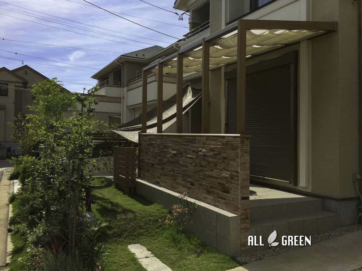 | 外構工事概要 | 岡崎市M様邸ガーデンルーム工事 タイルデッキ、シェード、ココマ腰壁タイプ、立水栓 |