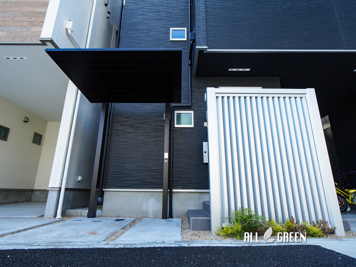 | エクステリア商品 | 目隠しフェンス:三協アルミ Mグローリア サイクルポート:LIXIL SCミニ 植栽:低木 混植 |