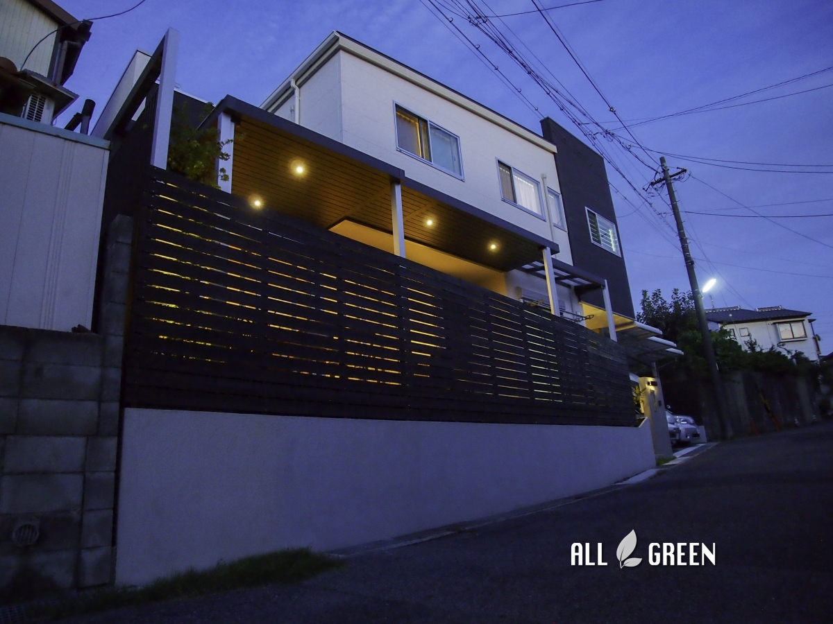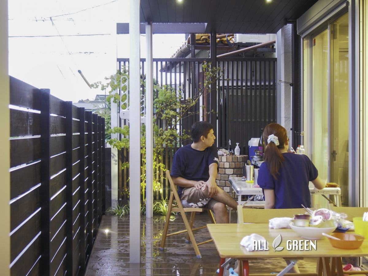 また写真の奥側には、Gスクリーンの縦格子タイプも取付し、空間をアレンジしつつ隣地との目隠しも出来ています。
