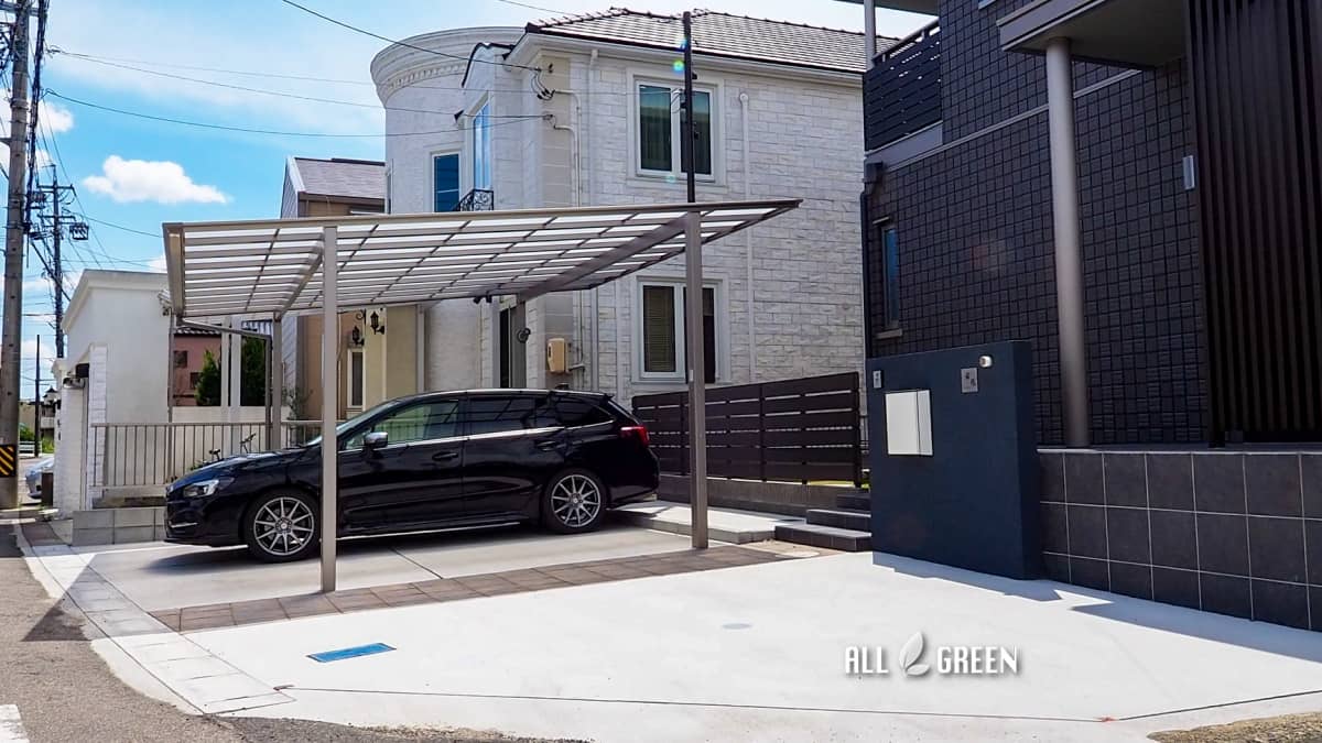 | 外構工事概要 | 春日井市I様邸新築外構 カーポート、駐車場、階段、門塀、目隠しフェンス、外周フェンス、表札、ポスト |