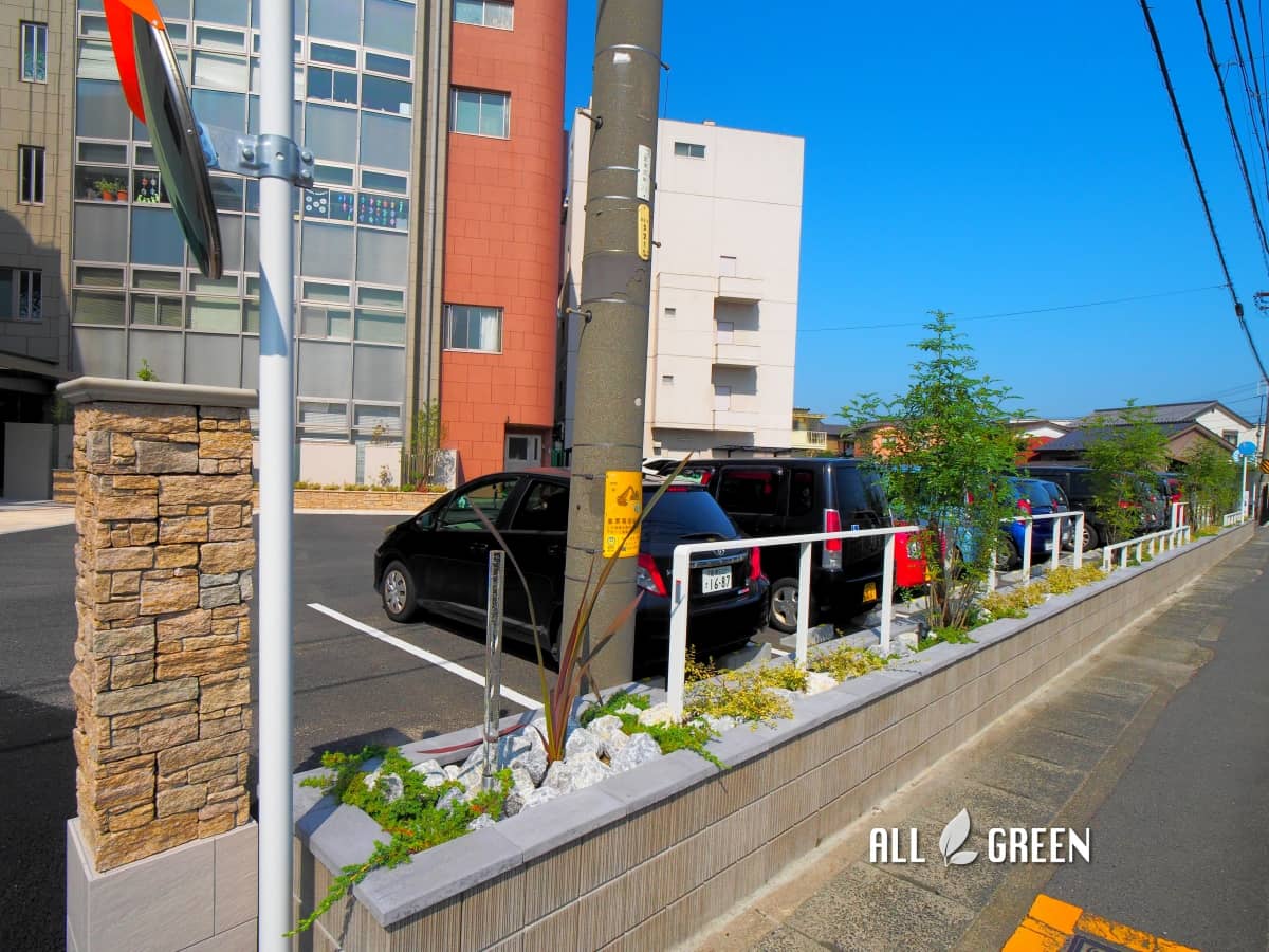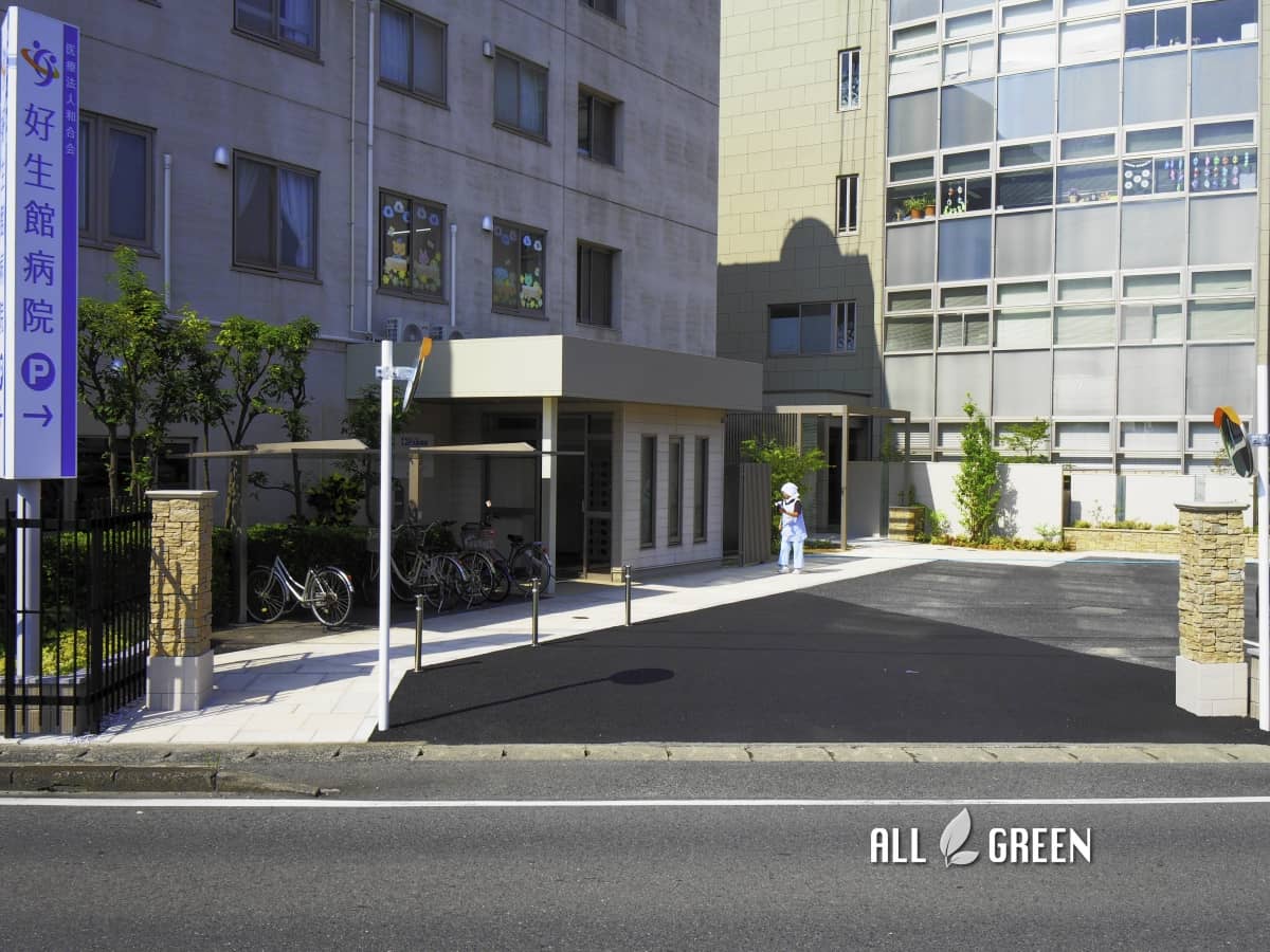 | 外構工事概要 | あま市好生館病院様 外構リフォーム工事 アスファルト舗装工事、化粧舗装工事、テラス屋根、ライティング、ブロック積、フェンス、カーブミラー、屋外看板、植栽、タイル貼り工事、角柱、車止め |