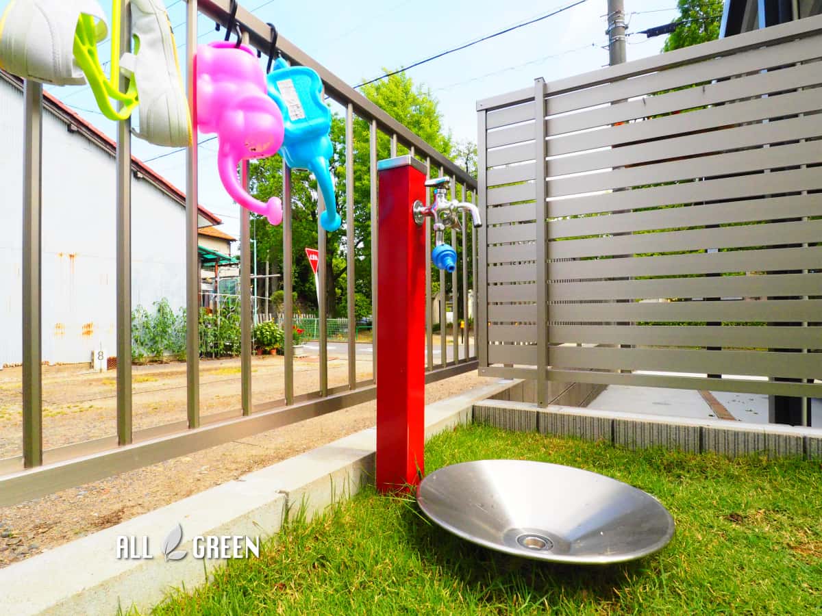 赤色の立水栓は、周囲のアルミ色と芝生の緑の中でとてもいい差し色となっています。