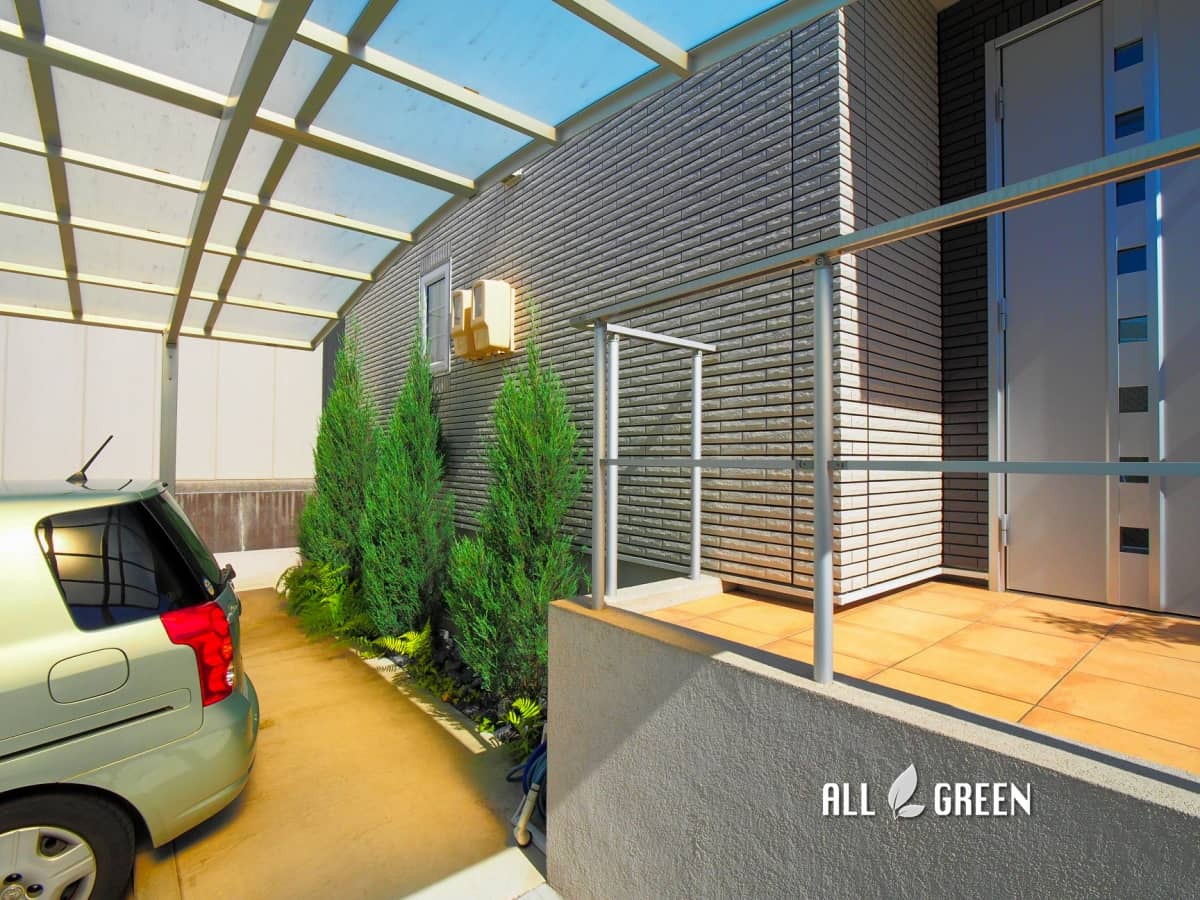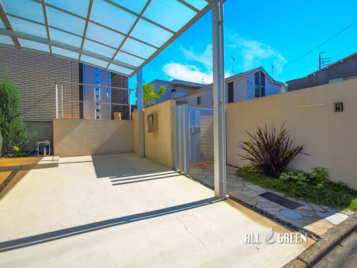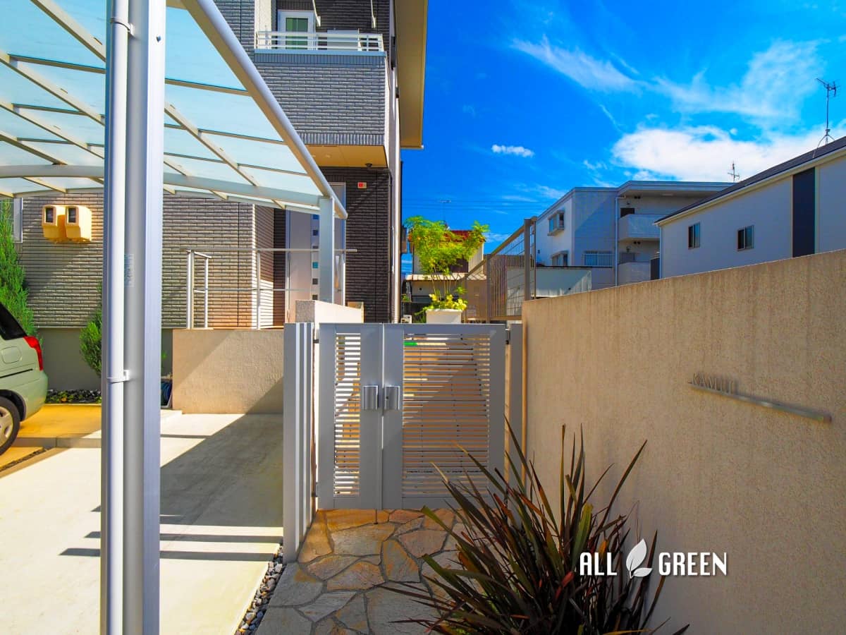 色の感触を掴まれやすい駐車場スペースと門塀は白色を使用。