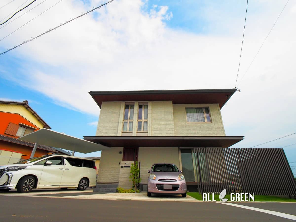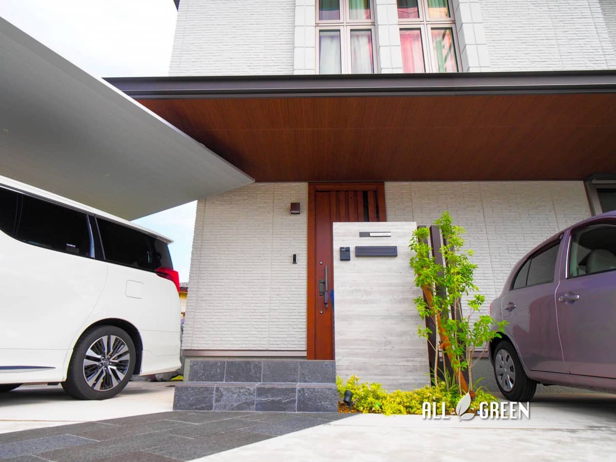 邸宅の立派な屋根とSCのバランスが美しい大府市にあるナチュラルかつモダンな外構