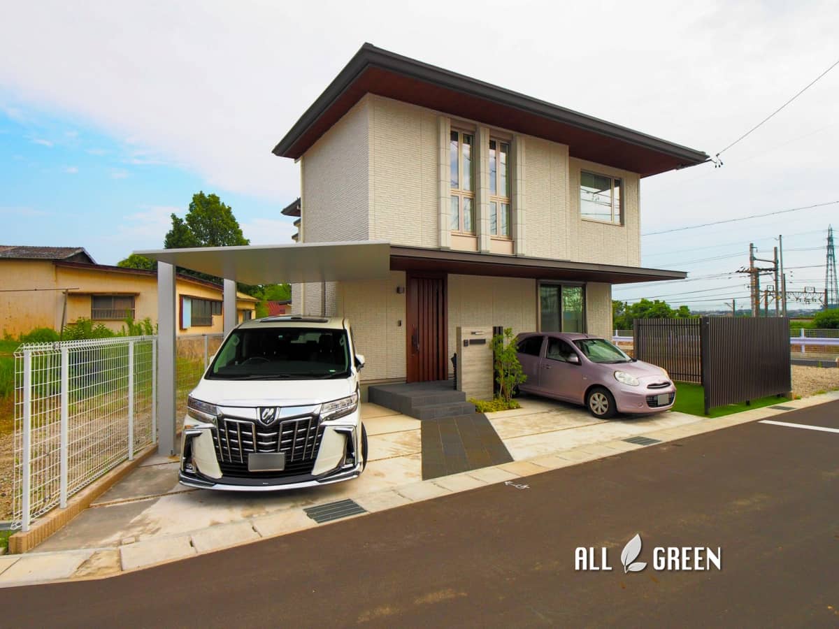 | エクステリア商品 | 駐車場:土間コンクリート 刷毛引き仕上 目地:川砂利目地 W70 カーポート:LIXIL SCレギュラー 30-50 ロング柱(ナチュラルシルバー) ダウンライト3ヶ所(ホワイト/スイッチ式) アプローチ:TOYO スクエアストーンプレート(バーナーブラック)300×600 フェンス:スチールメッシュフェンス H1500 門塀:普通150CB積(+1780) タイル:Takasho セラウォール ポスト:LIXIL エクスポストS-3型 2B-05 表札:美濃クラフト MX-14 枕木材:LIXIL 70角 H1700 3本(オータムブラウン) 照明:Takasho ガーデンアップライトミオ 12V (シルバー) |