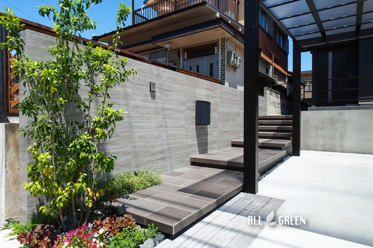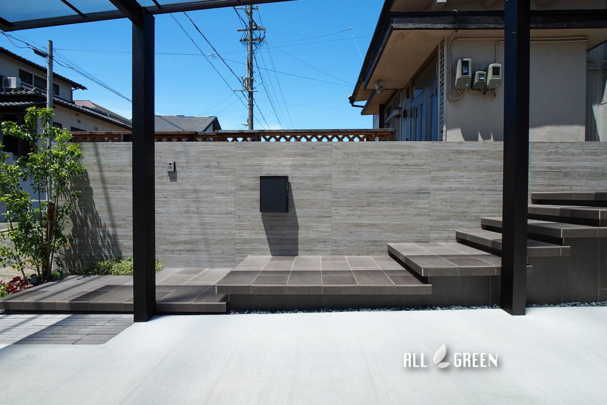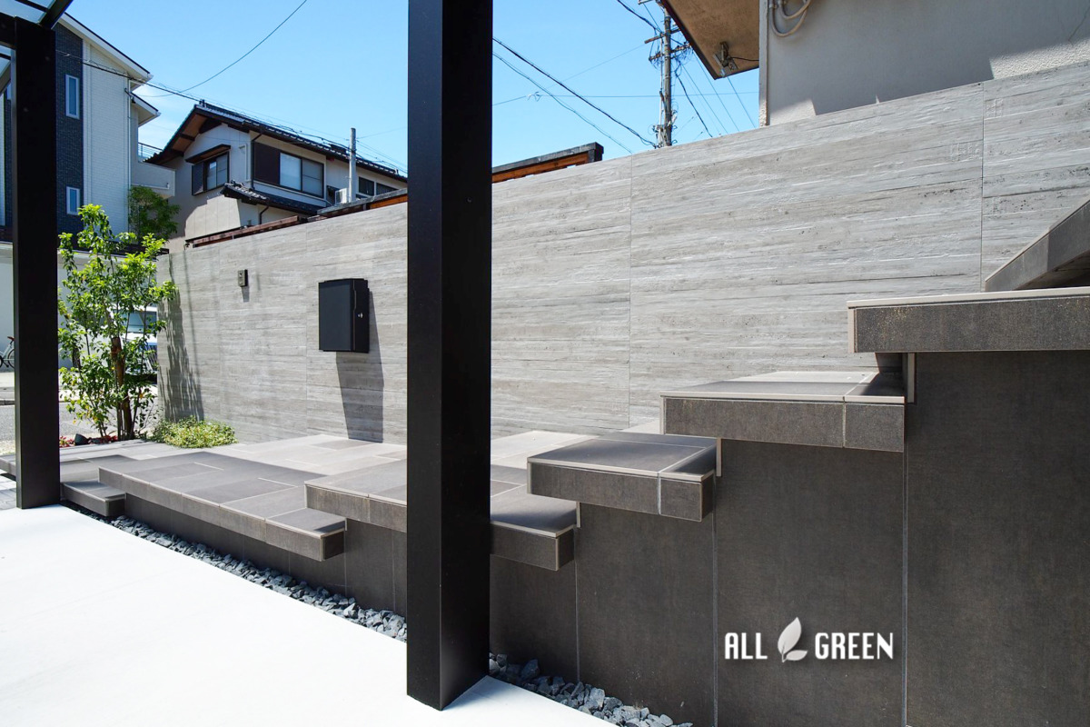 | 外構工事概要 | 千種区S様邸新築外構 駐車場、カーポート、アプローチ、階段、門壁、表札、ポスト、フェンス、照明 |