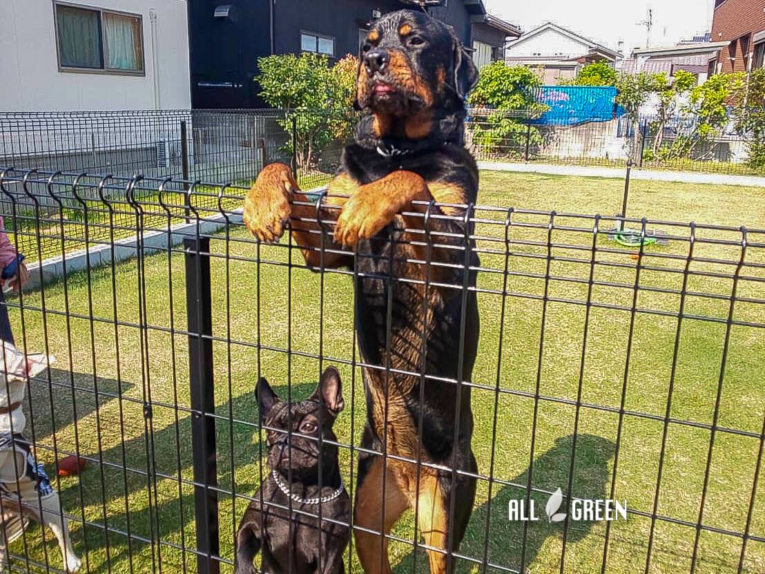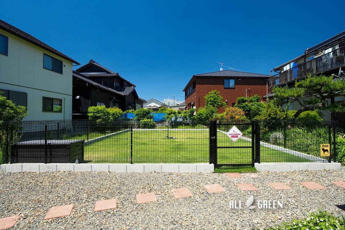天然芝を敷き、フェンスで囲うという一見シンプルなドッグランですが、お施主様がご用意し門扉とフェンスにつけられたドッグランですよと一目でわかる標識風の看板が愛情を物語っていますね。