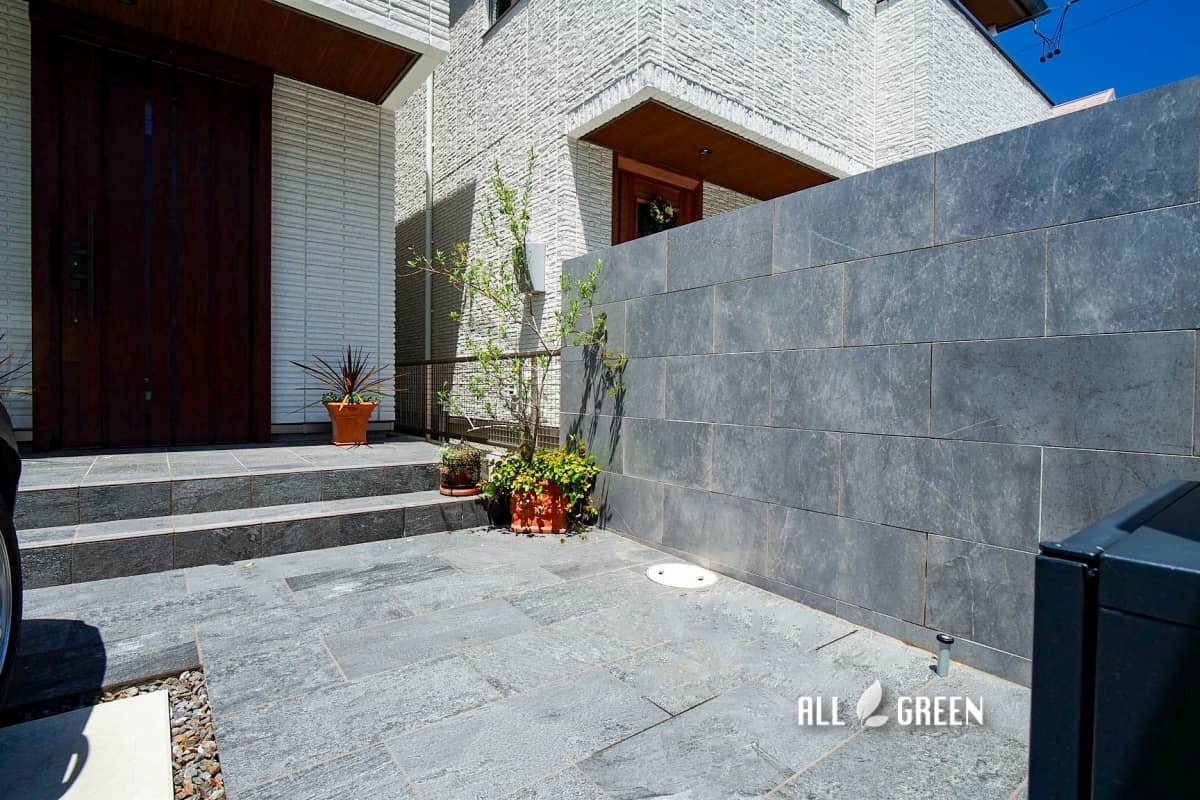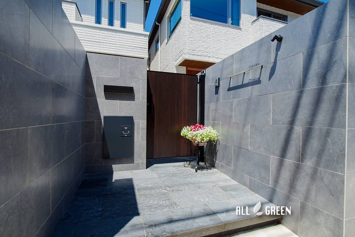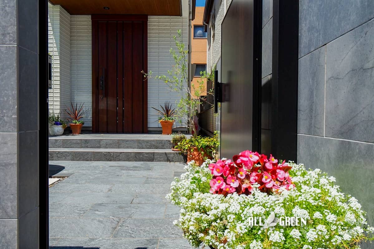 門扉を抜けた先に広がるアプローチは、門塀と同じグレーのタイルを。お施主様のご趣味で置かれている鉢植えがとっても素敵ですね。
