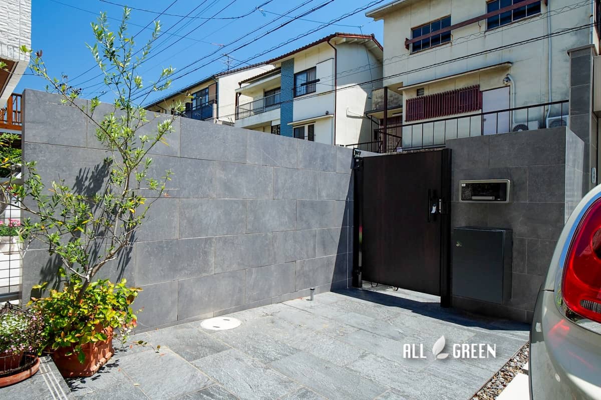 艶のあるタイルとシャッターゲートが特徴の名古屋市千種区にあるクローズ外構
