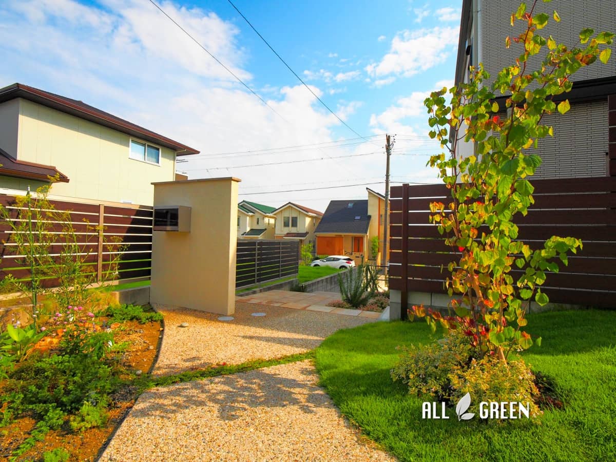 ポストとフェンスは木調のものを設置し、邸宅のように所々木調を入れ統一感をだしています。