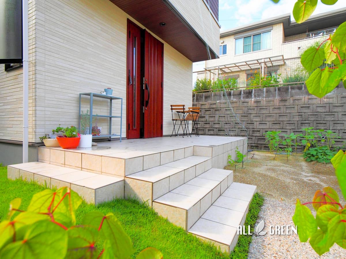 アプローチ部分や階段に使われているのと同じように温かみのあるカラーのタイルは門塀に華やかさをプラスしてくれています。
