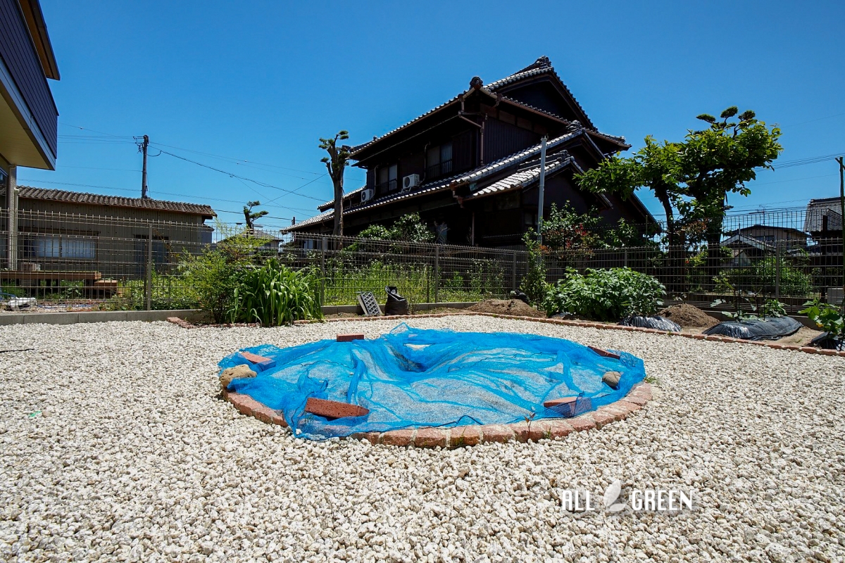 防草対策としてお施主様がご希望された” 花壇と砂場の周りは全面砂利 ”というのは白川砂利で対応。