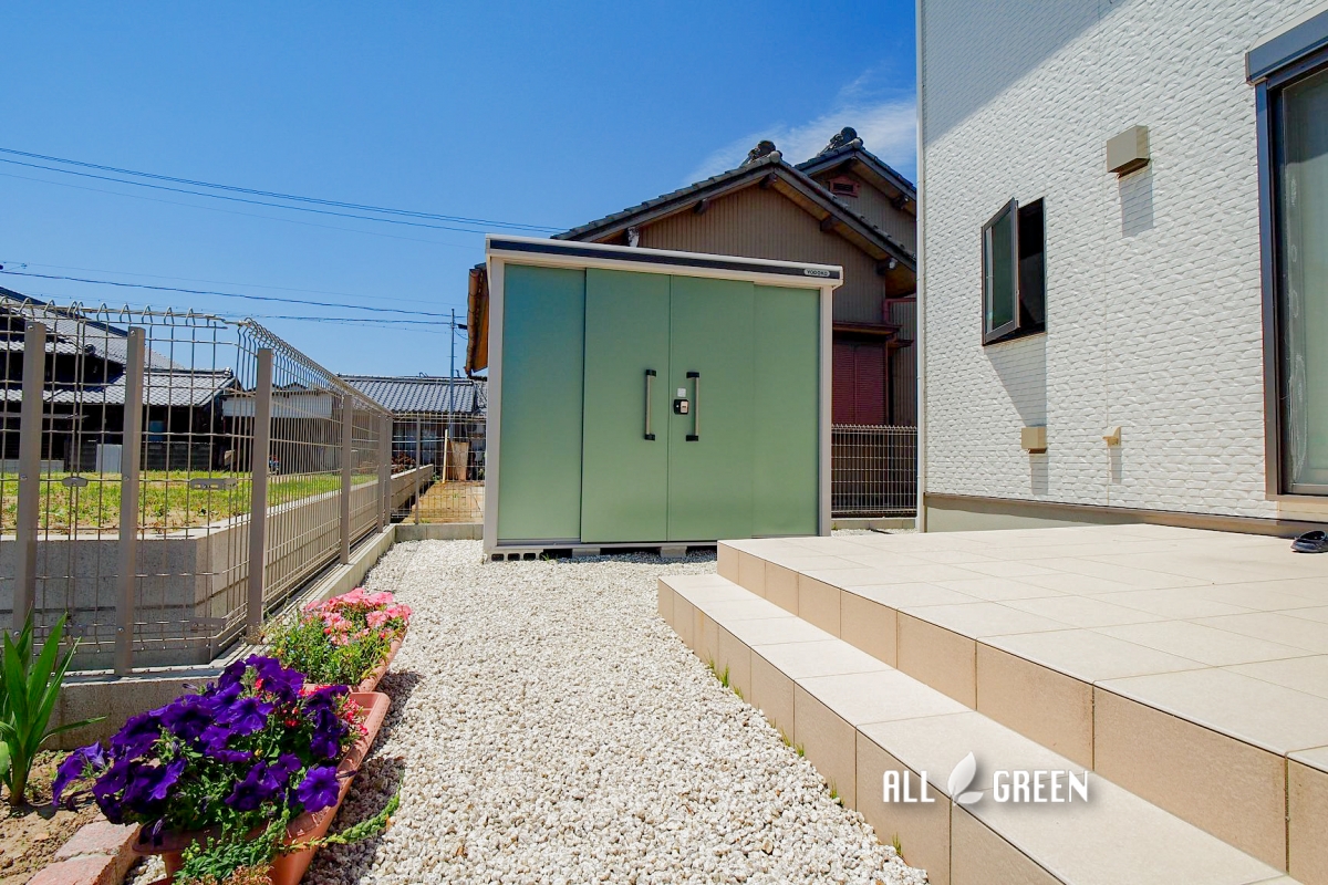 物置はヨド物置。家庭菜園で使用するものやお子様のお庭で遊ぶ用のおもちゃ。大きくて立派な物置は外で使うあれこれの収納に大活躍しているそうです。