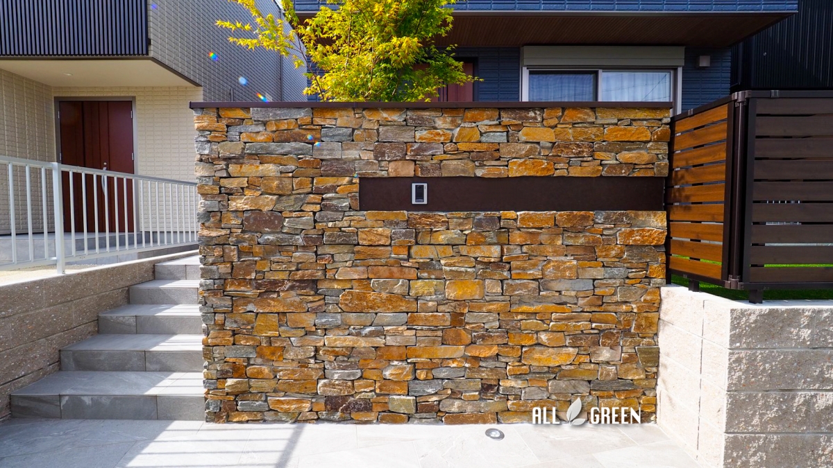 石積みのような見た目で天然石ならではの色合いが特徴的な門塀にアクセントボードのスリットをいれました。