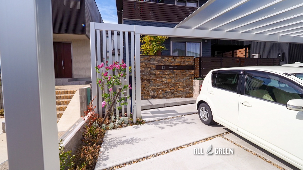 カーポートは植栽部分を除く敷地いっぱいに間口を広げて設置。