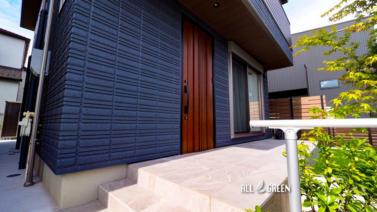 メテオブルーの外壁にあうナチュラルな外構にしたいとのことでしたので温かみのあるカラーで包み込むようなイメージでデザイン。