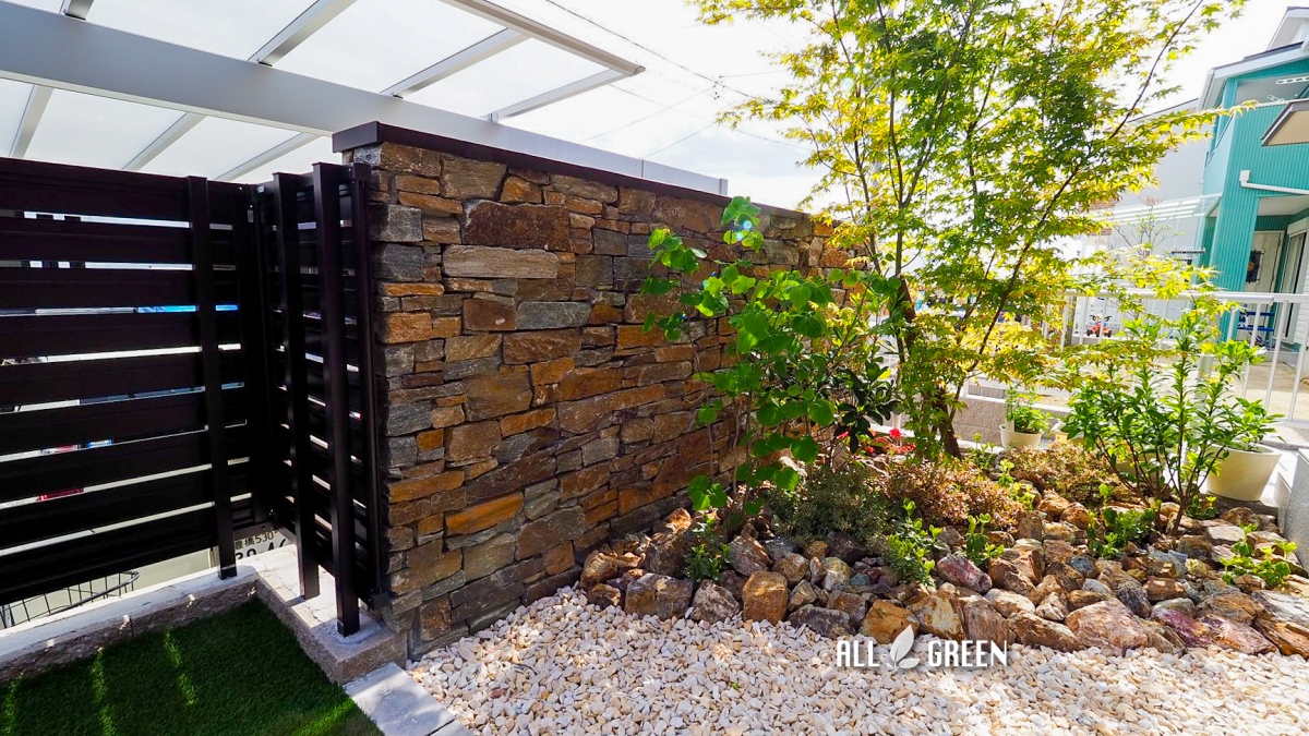 ナチュラルなのにインパクトを忘れていない天然石でつくられた門塀がお出迎えしてくれる名古屋市守山区の新築外構