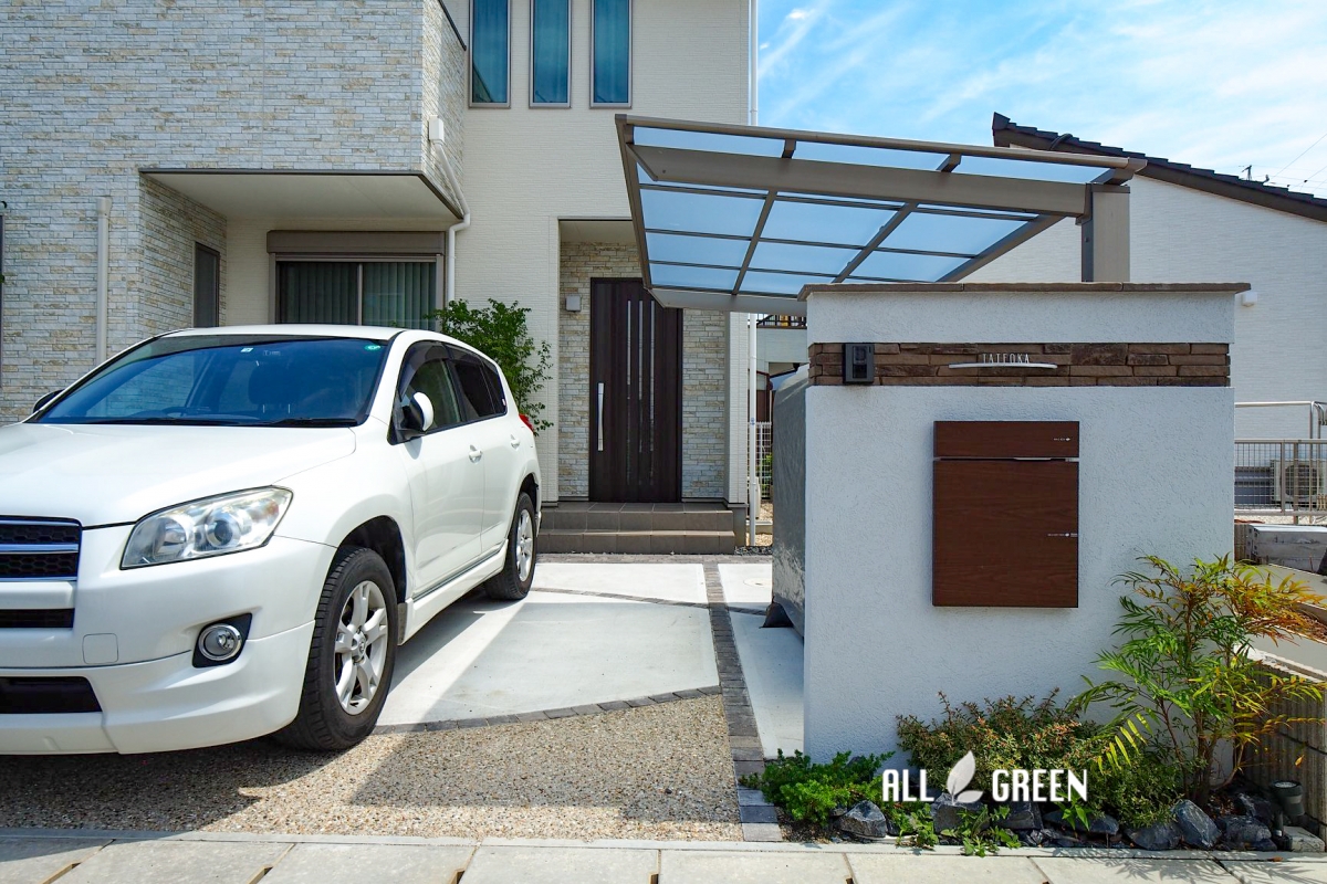 駐車場、アプローチ、サイクルポート、門塀、ポスト、宅配ボックス、目隠しフェンス、フェンス、植栽