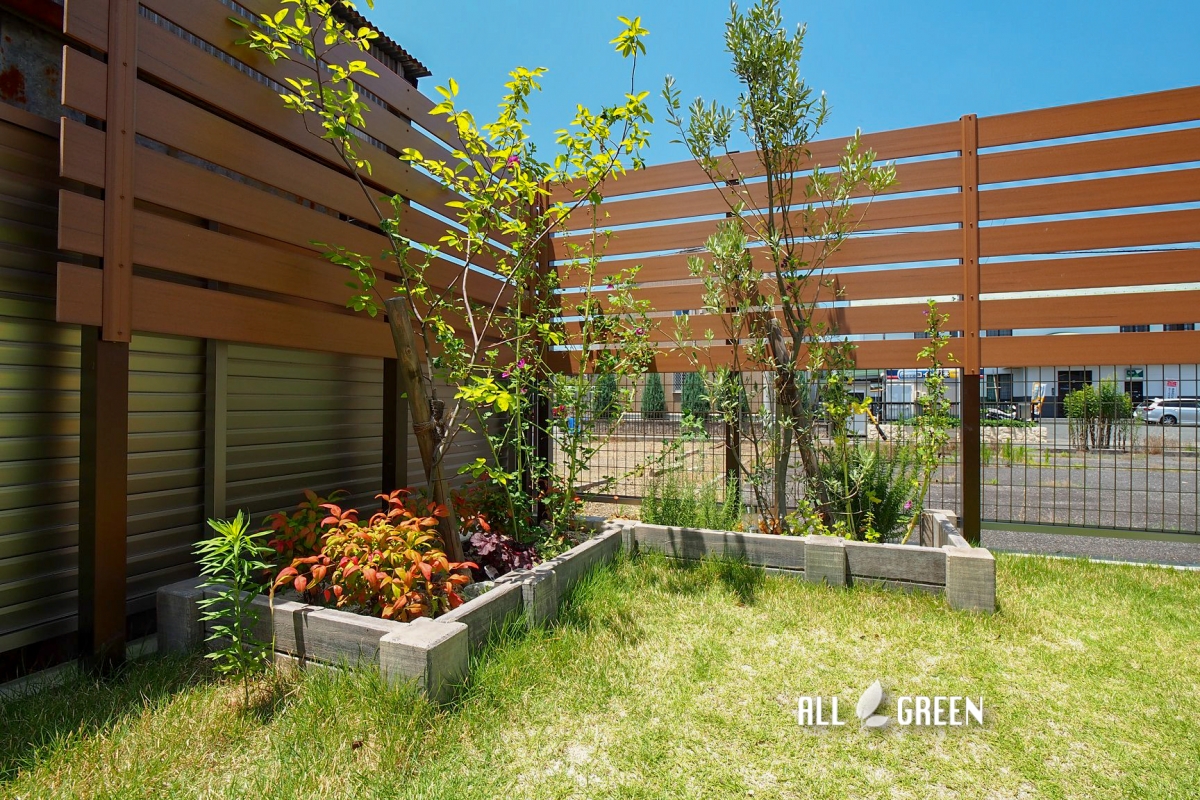 目隠しフェンス、花壇、植栽、芝、見切り材、