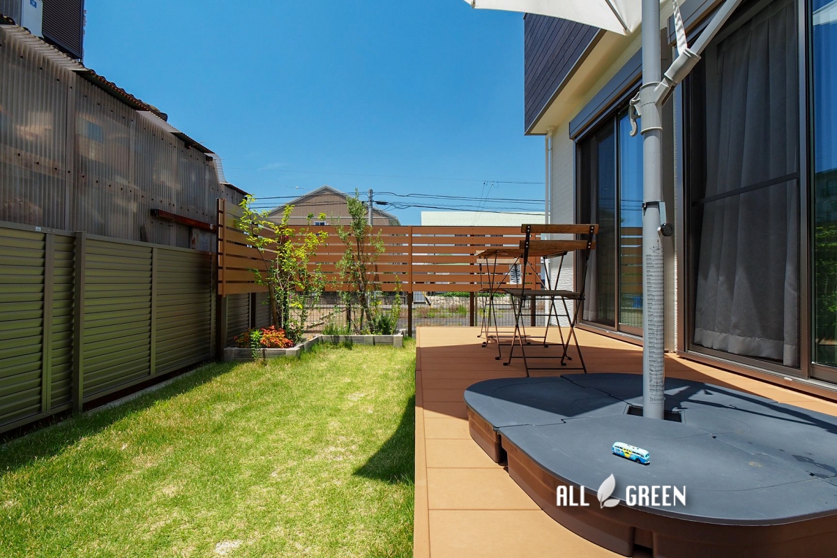 天然芝か人工芝か。メンテナンスの面で迷われていたお庭全体に敷かれた芝は ” 天然芝でもいけるかな‥? ”という一言で天然芝に。