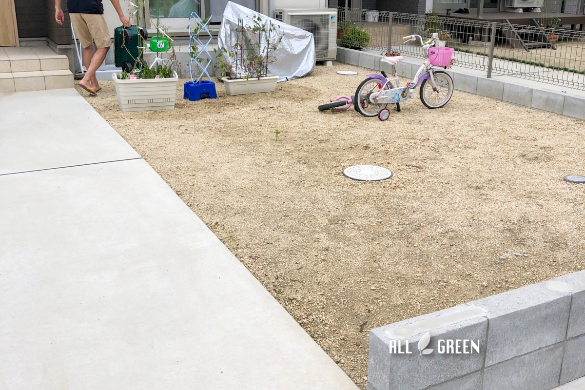 雨が降った日の翌日かなり土がぬかるんでしまうと気にしていた土のままだったお庭は” ぬかるんだままじゃ子供が遊びづらくて ” ” 子供が転んでしまったら危ない ” とお子様を想いのご夫婦の意向で人工芝を一面に敷きました。