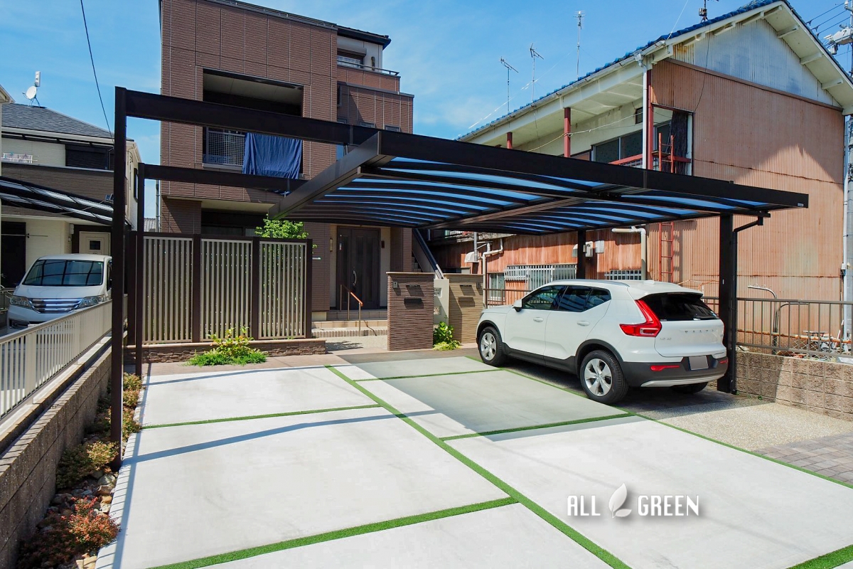 名古屋市中川区のリフォームでつくられたシンプルなフォルムでカッチリ決まったカーポートとグリーンの目地が優しい印象の駐車スペース